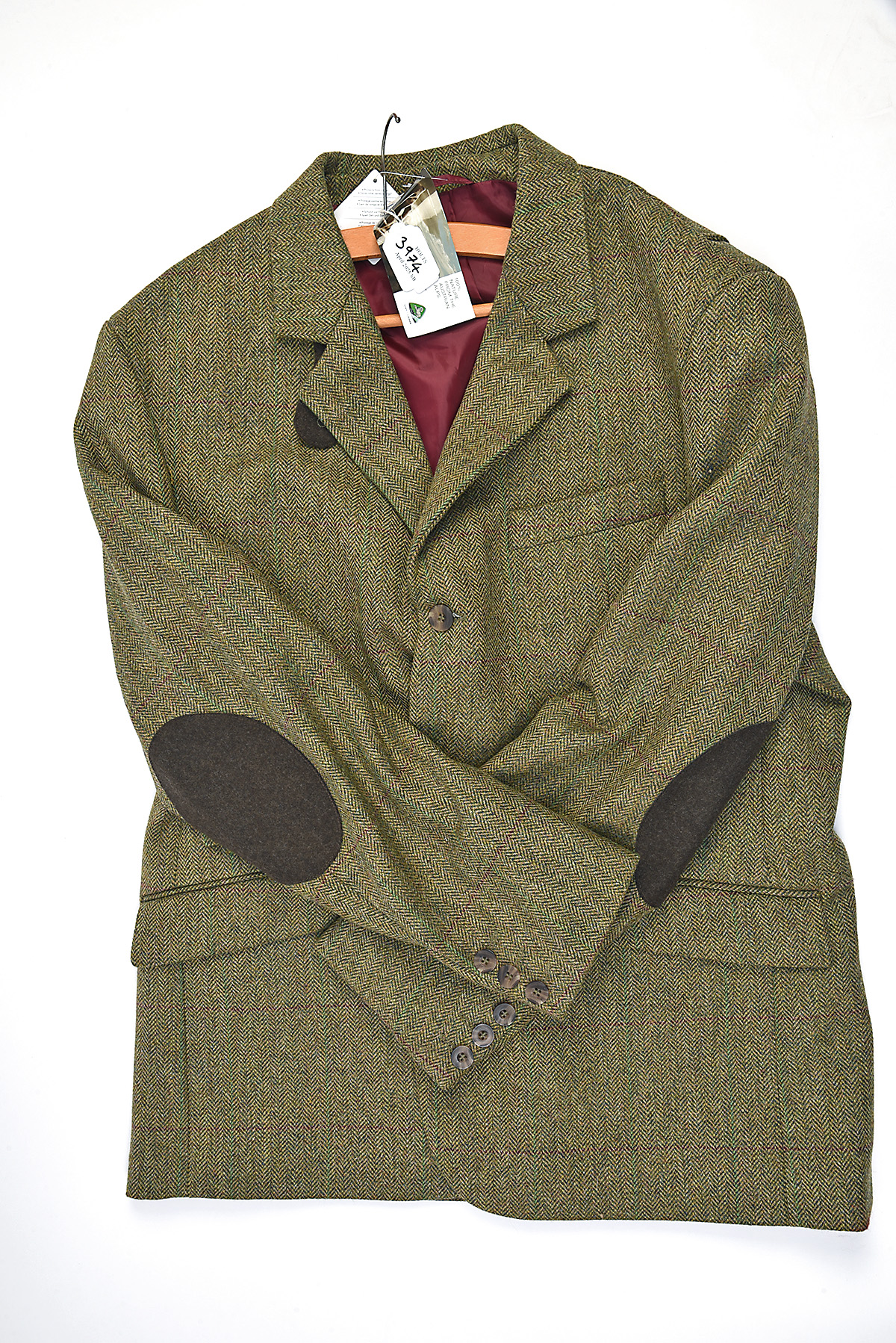 A UNUSED 'LAKSEN DORSET' TWEED SPORTS JACKET, teflon coated, 'THRIE ESTAITS' luxury Scottish sporting 'OVERCHECK HERRINGBONE' tweed in green with light green and burgundy stripes, size 2XL