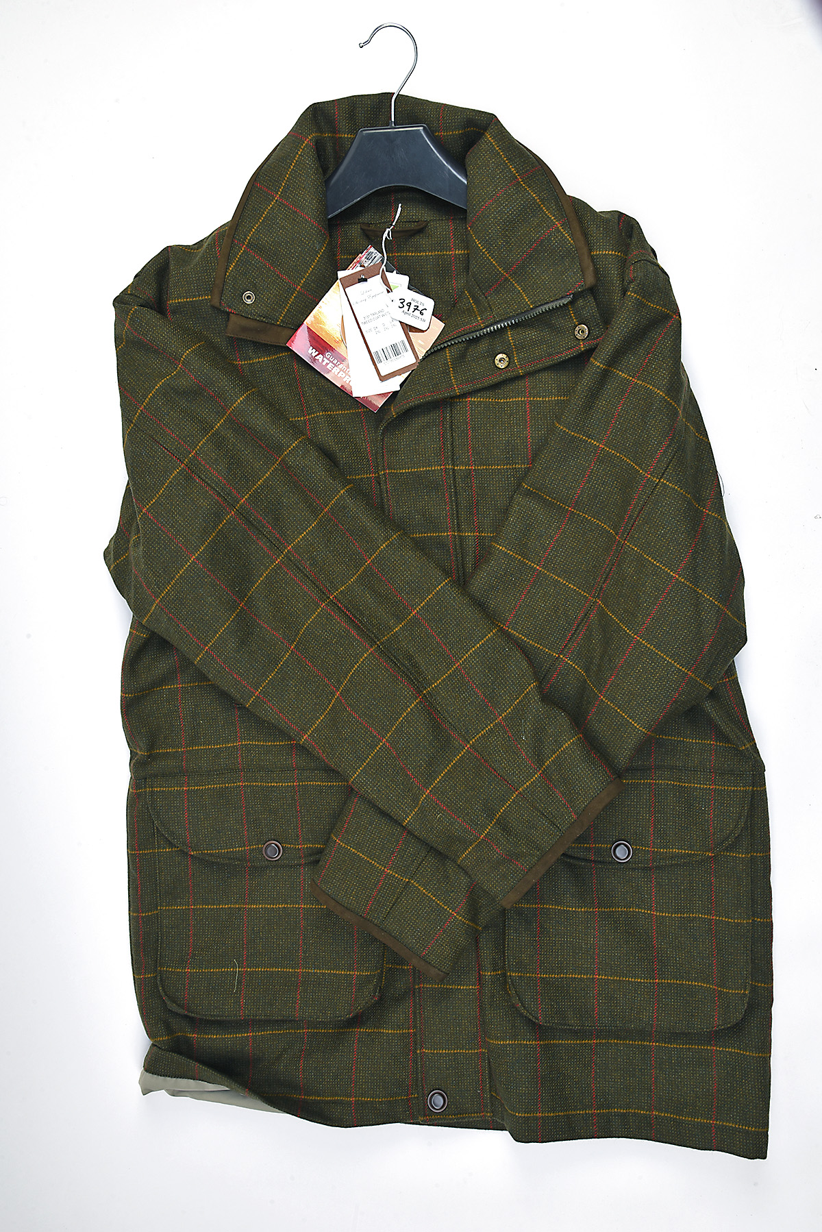 A UNUSED 'LAKSEN TARLAND' TWEED JACKET, CTX waterproof membrane teflon coated, 'THRIE ESTAITS' luxury sporting 'OVERCHECK TWILL' tweed in green with red and yellow check, size 2XL