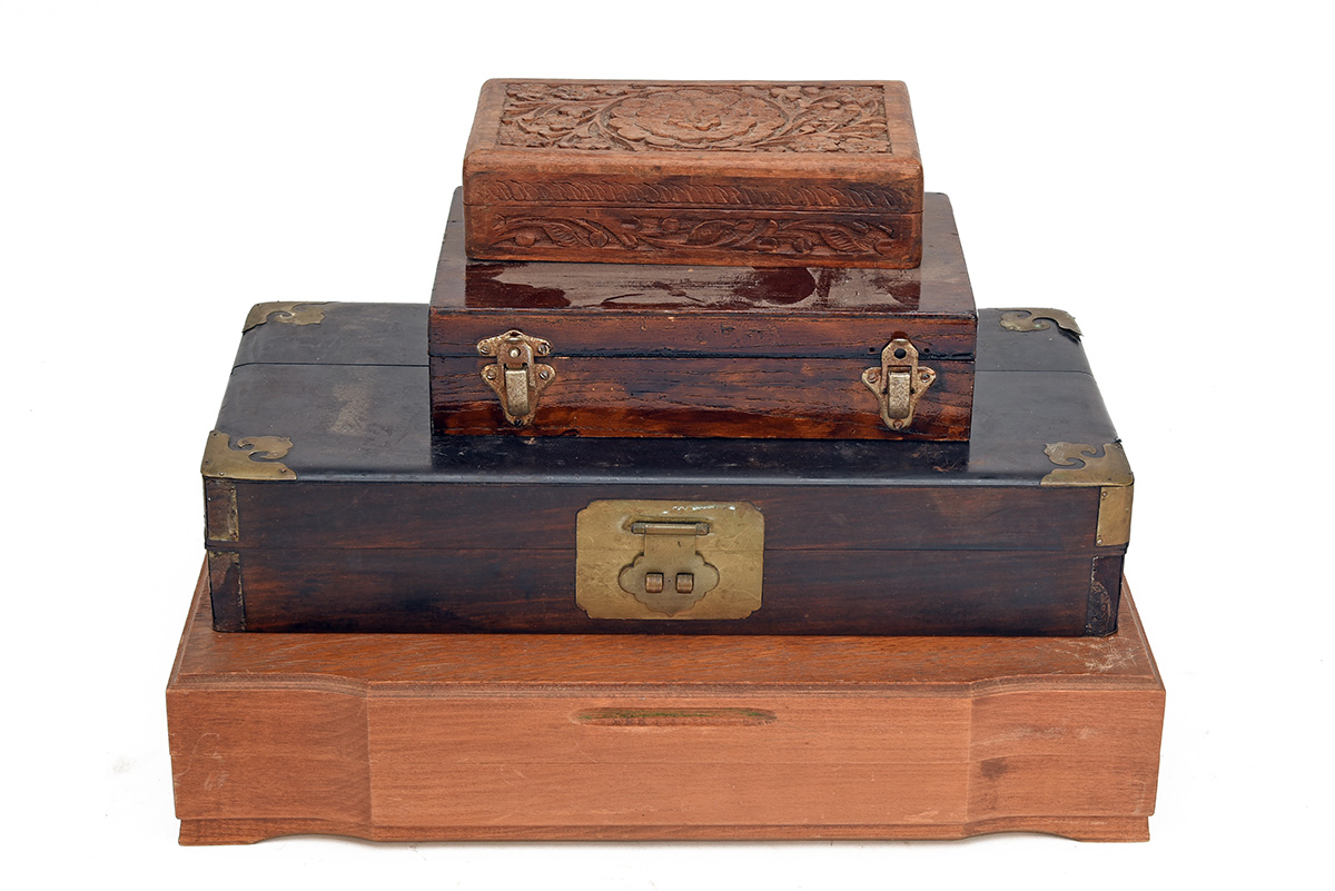 FOUR VARIOUS WOODEN CASES, 1 approx. 15 1/4in. x 11 1/4in. x 3in. fitted for cutlery, red cloth lined, 1 approx. 14 1/4in. x 7in. x 2 3/4in. brass cornered and fittings (crack to lid), 1 approx. 8 1/2in. x 5 1/2in. x 2in. green cloth lined, 1 approx. 7 1/4in. x 4in. x 1 3/4in. floral carved, (4)