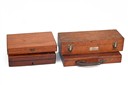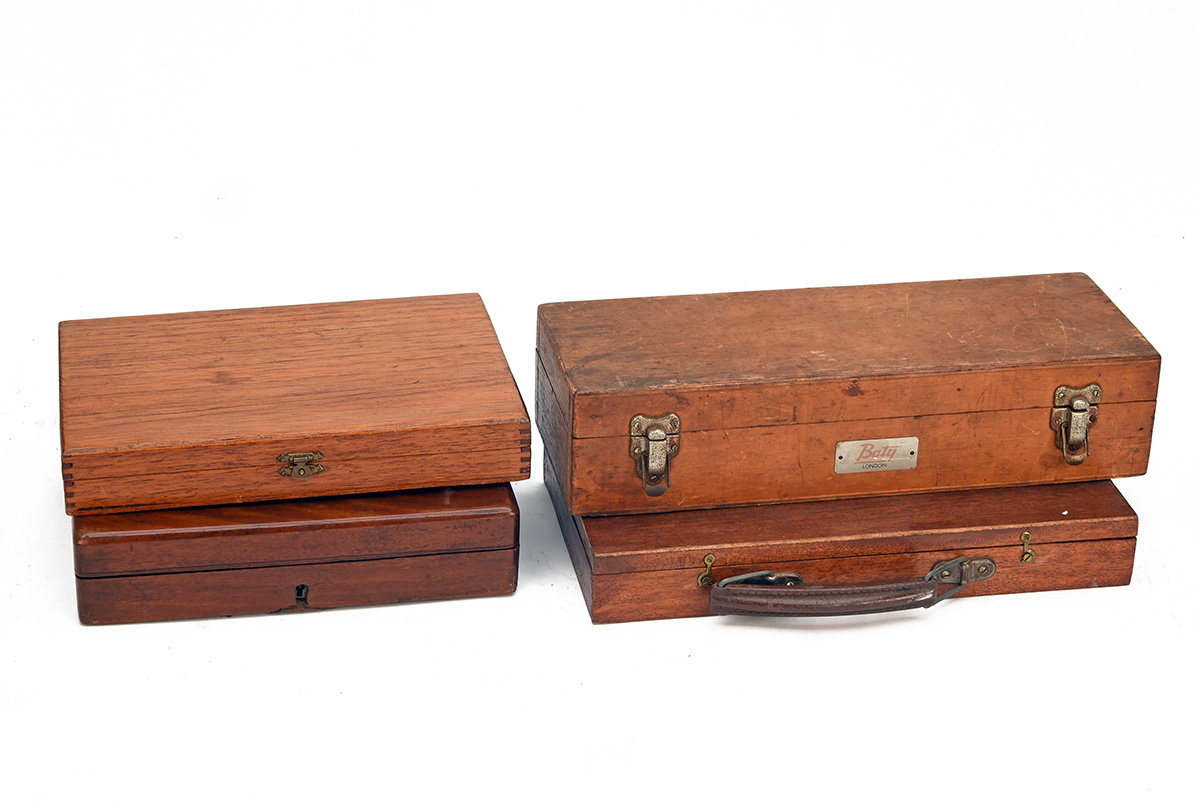 FOUR VARIOUS WOODEN CASES, 1 approx. 12 1/2in. x 7in. x 2in. with handle, 1 approx. 10in. x 7in. x 1 1/2in. red cloth lined, 1 approx. 9 3/4in. x 7 3/4in. x 2 1/4in. plain brass escutcheon on lid, fitted for cutlery, 1 approx. 13 3/4in. x 5in. x 3in. labelled 'BATY LONDON' (4)