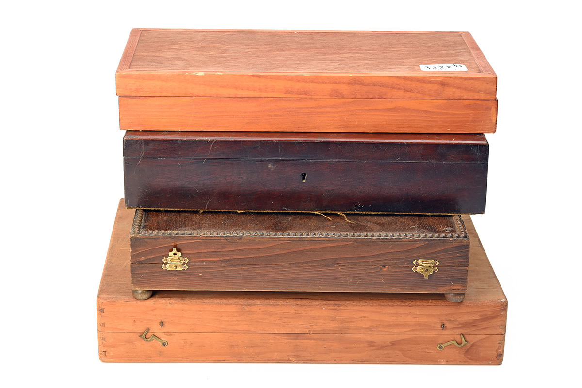 FOUR VARIOUS WOODEN CASES, 1 approx. 15 3/4in. x 10 3/4in. x 2 3/4in., 1 approx. 12 3/4in. x 9 3/4in. x 2 1/2in. blue cloth liner, fitted for cutlery, 1 approx 14in. x 8in. x 3in. green cloth liner, lockable (key missing) 1 approx. 14 1/2in. x 7 1/4in. x 2 1/4in. hand made fitted for revolver (4)