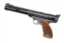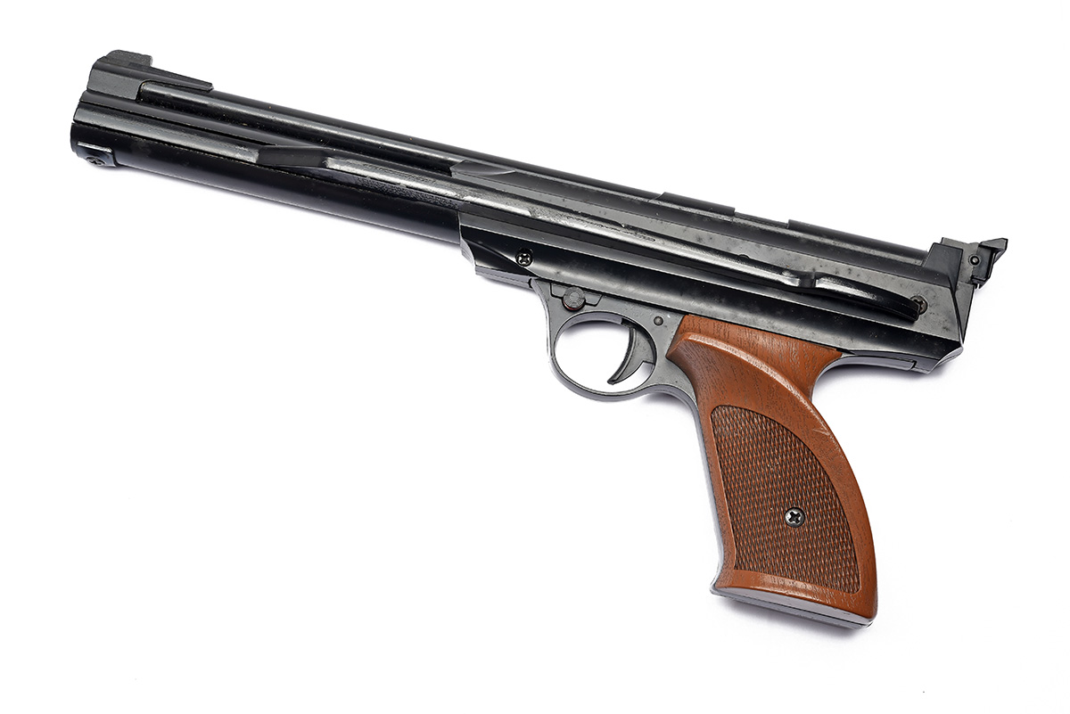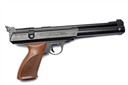 A BOXED .22 DAISY 722 SINGLE-STOKE PNEUMATIC AIR-PISTOL, serial no. C017637, with blacked9 5/8in. barrel, blacked receiver and pump-housing, side-lever pump and chequered plastic right hand grips, in its maker's card and polystyrene carton with targets