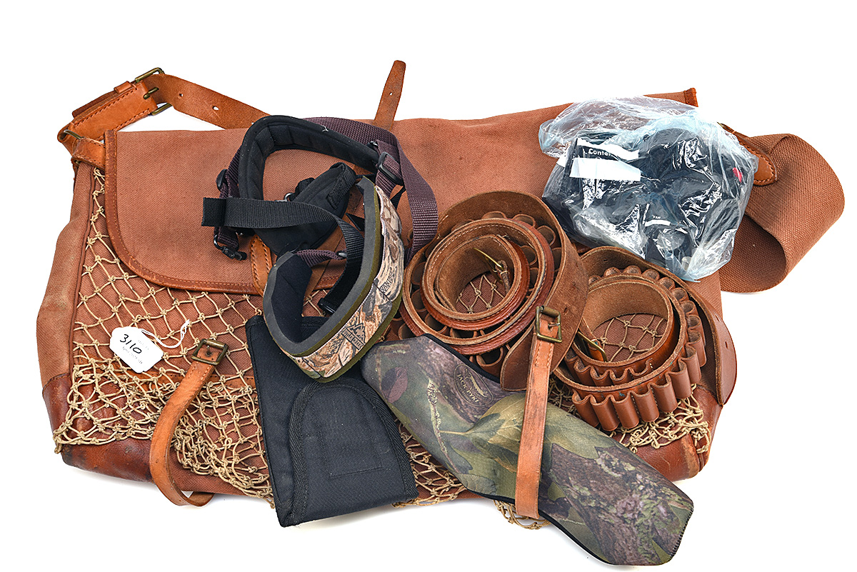 A 'BRADY' GAME BAG WITH SHOOTING RELATED ITEMS, comprising of a 'BRADY' canvas and leather game bag in light brown, 'JACK PYKE' camo scope cover, 'BUTLER CREEK' camo rifle sling, 'MOSSY OAK' rifle sling, black nylon holster, 1 leather .410 cartridge belt, 25 capacity, brass fittings in brown, 1 leather 12-bore cartridge belt, 25 capacity, brass fittings in brown, 3 pairs of scope rings, 2 pairs of 'BUTLER CREEK' flip-up lens covers