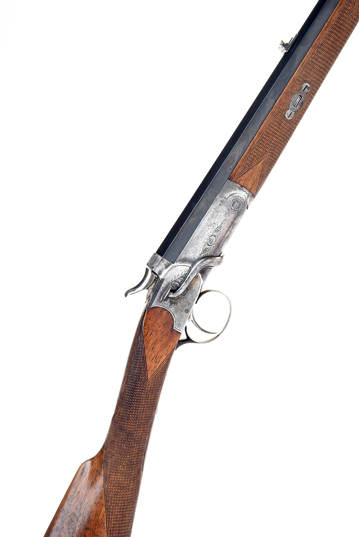A .297/300 SINGLE BARRELLED ROOK & RABBIT RIFLE, UNSIGNED, serial no. 10114, with reblued octagonal 26in. barrel, engraved side-lever action of Belgian form with central hammer, chequered walnut butt-stock and fore-end