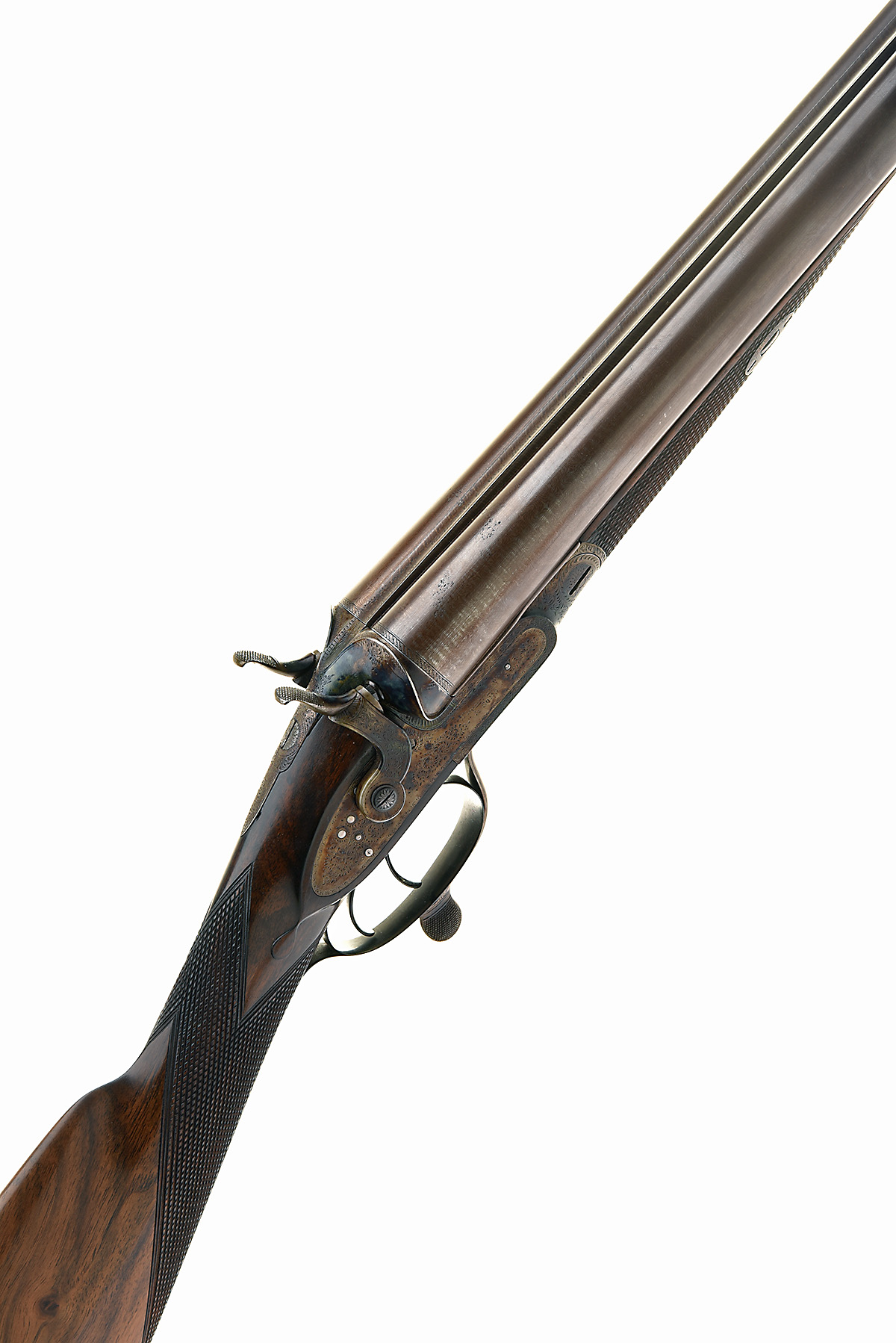 WILLIAMSON & SONS 8-BORE DOUBLE-BARRELLED ROTARY-UNDERLEVER HAMMERGUN, serial no. 519, serial number on under rib only, circa 1870, 32in. nitro reproved bold damascus barrels, the rib engraved 'WILLIAMSON & SONS. BRIDGENORTH & LUDLOW', Jones patent rotary underlever, carved serpentine fences, non-rebounding sidelocks with flat nose high-spurred hammers, fine acanthus scroll engraving with ornate bordering, retaining virtually full renewed colour-hardening, 14 1/4in. stock including 7/8in. recoil pad, fore-end with crosspin release, weight 8lb. 14oz., in a Brady canvas and leather case