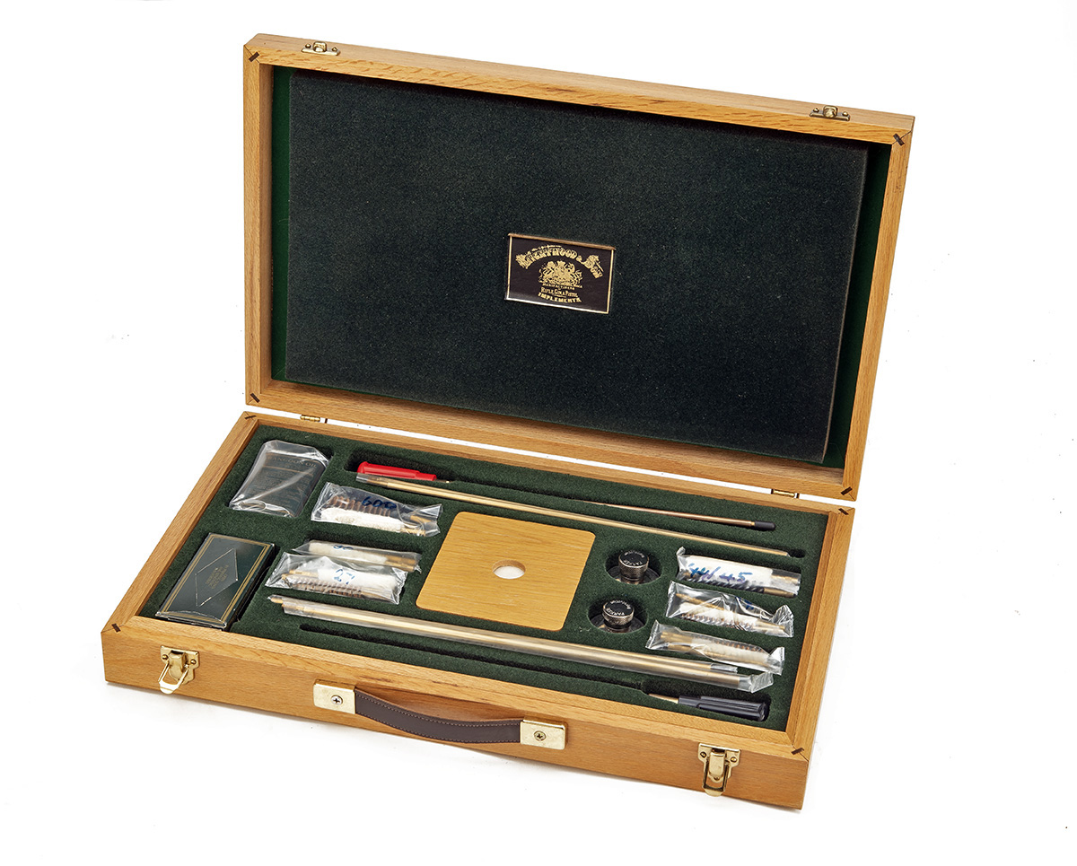 LIGHTWOOD & SON 'SAFARI' SIX CALIBRE SOLID AMERICAN UNUSED OAK RIFLE CLEANING KIT, to include, large calibre, brass, 3-part Parker Hale cleaning rod; small calibre, brass, 3-part Parker Hale cleaning rod, 2 x nickel plated round oil flasks; box of 25 4x2 patches; 125ml Rangoon oil; accessory compartment with more patches and cloth: six complete 3 brush sets in calibres .22, .24, .27, .30, .45 & .600;