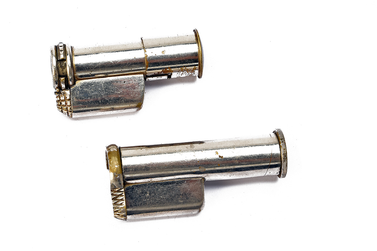 TWO NICKEL PLATED FRONT SIGHT MUZZLE PROTECTORS, 1 stamped 'THE XL' (2)