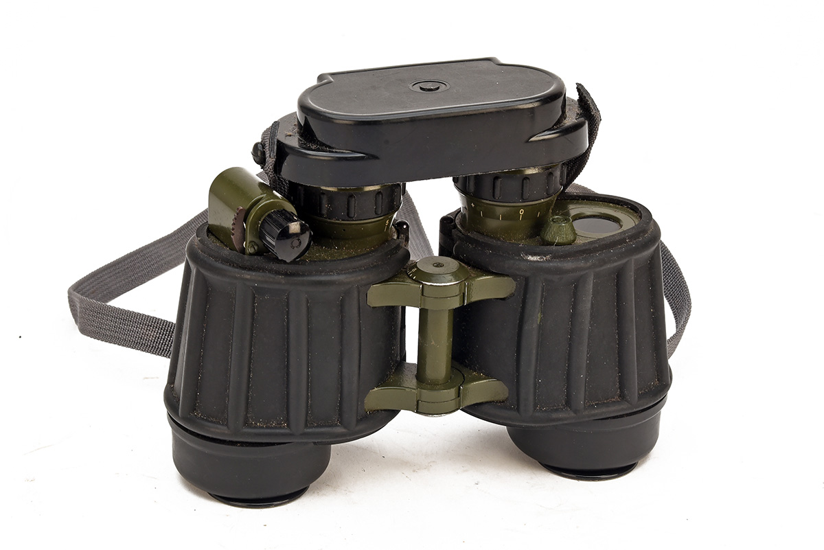 A RARE EAST GERMAN STASI 7x40 CARL ZEISS JENA BINOCULAR, circa 1950s, rubber armoured body and soft rubber folding eye-cups, independent eye-piece focussing, graticule in right eye-piece, front plate marked 'MdI' for Ministerium des Innern [i.e. Ministry of the Interior for STASI use], has a detector for active infra-red sources charged by the UV contribution of the daylight, complete with rain-guard, carry strap and lens caps