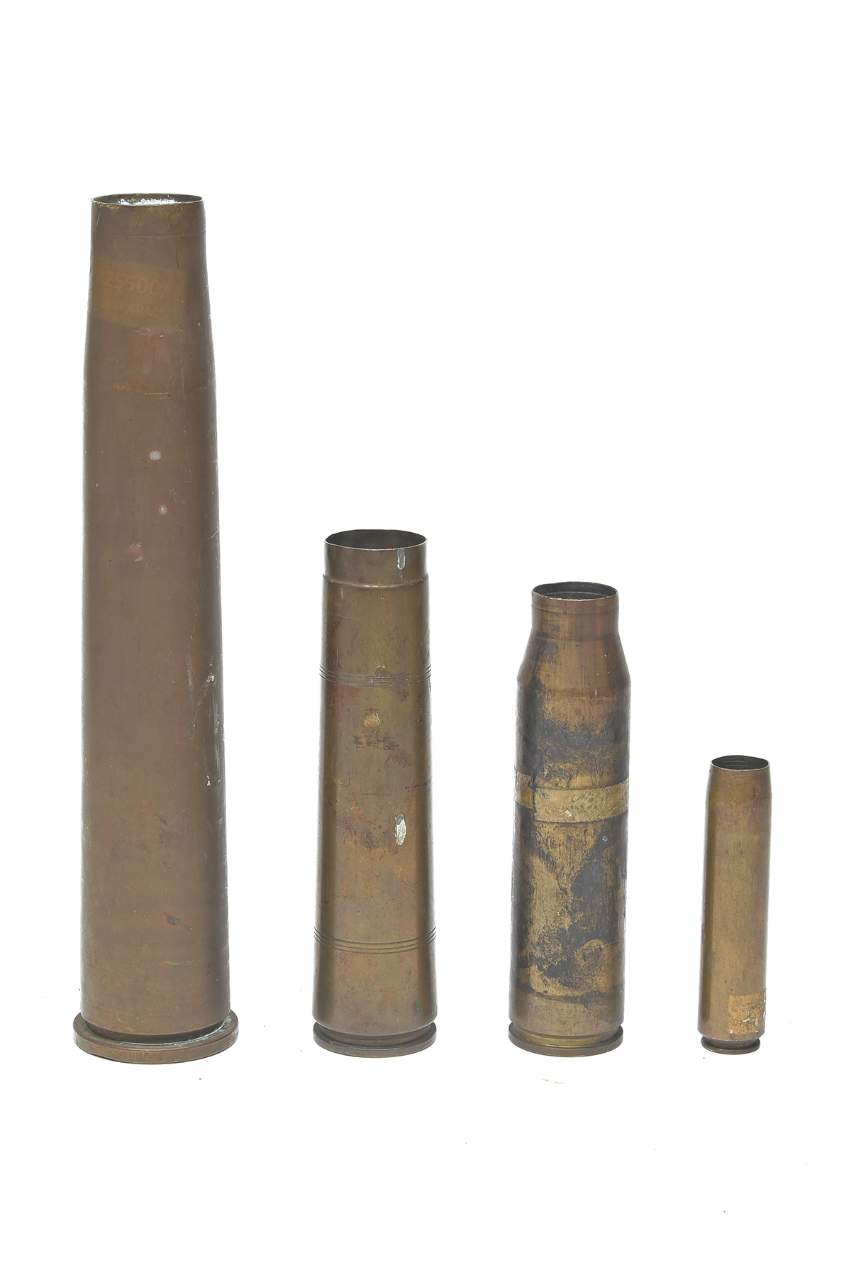 FOUR BRASS SHELL CASES, being 1) a 40mm Bofors dated 1953, no fuse; 2) a 1 1/2 pdr Mark III dated 1918, no fuse; 3) a 1940s 30mm AVF, hole drilled in side; 4) a 20mm cannon shell dated 1942 (4)