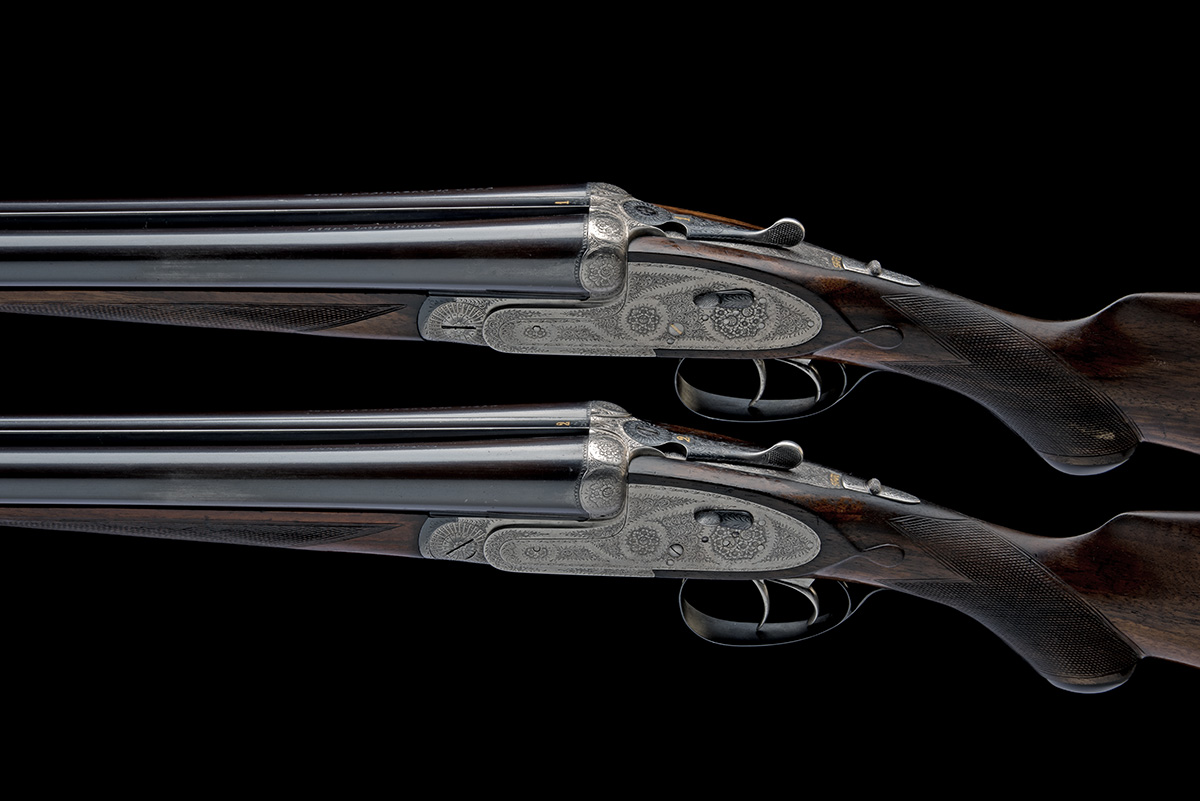 for 1980, 28in. nitro chopperlump barrels, the ribs gold-inlaid '1' and '2' at the breech ends, the tubes engraved 'PEDRO ARRIZABALAGA EIBAR ACERO CROMO-NIQUEL', 2 3/4in. chambers, bored approx. true cyl. and 1/4 choke, treble-grip actions with hidden third bites and side-clips, removable striker discs, toplevers gold-inlaid '1' and '2', automatic safeties with gold-inlaid 'SAFE' details, Holland & Holland style self-opening systems, hand-detachable lockplates, cocking-indicators, articulated front triggers, rolled-edge triggerguards, acanthus scroll engraving with floral bouquets, bright and blued finish, 15 1/4in. Prince of Wales pistolgrip stocks with pistolgrip-caps, weight 6lb. 13oz. (No.1) and 6lb. 15oz. (No.2), in their brass-cornered leather case