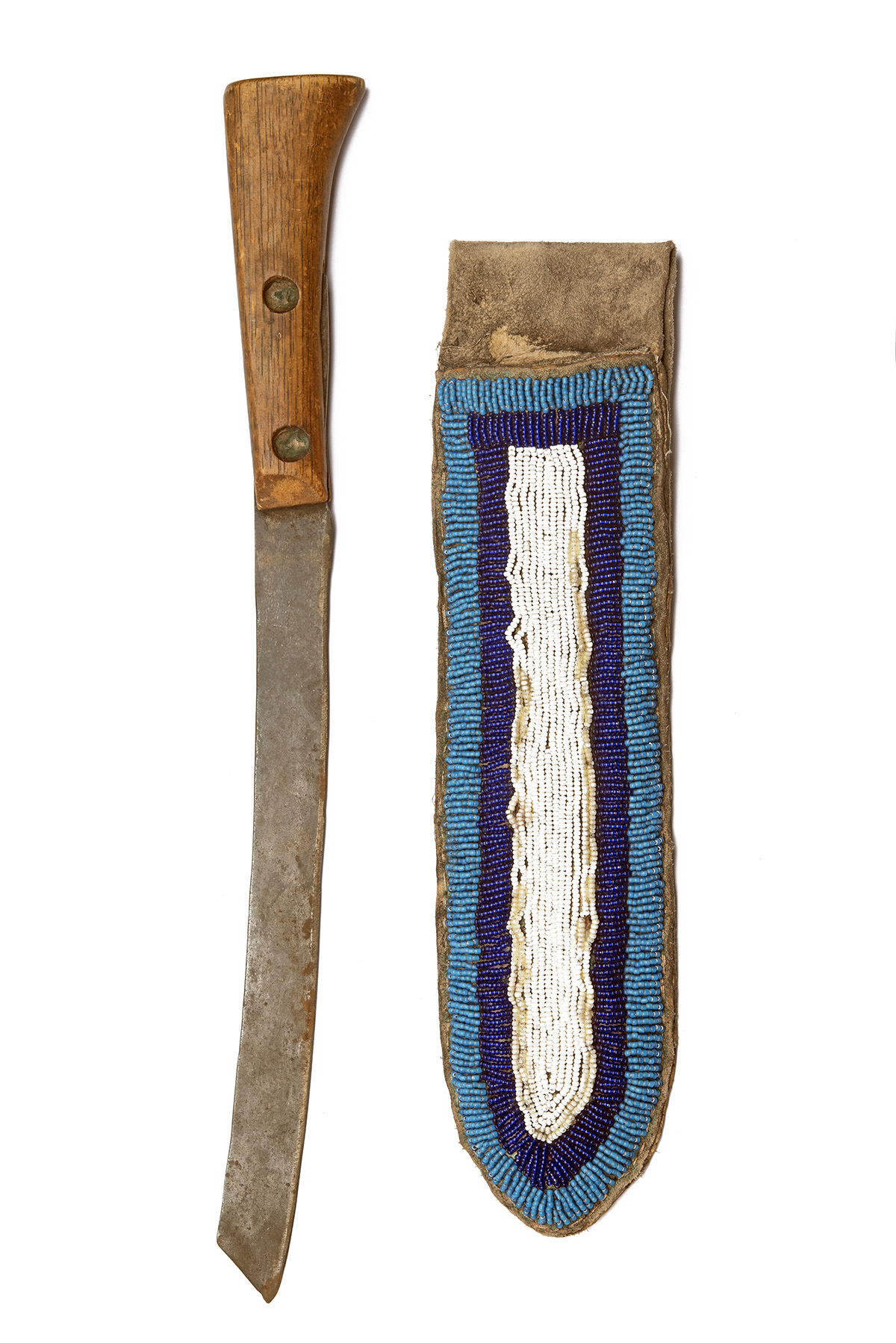 AN EARLIER AMERICAN PLAINS INDIAN GLASS BEADED LEATHER SCABBARD WITH KNIFE, circa late 19th-early 20th Century, canvas-lined scabbard decorated with light blue, dark blue and white glass bead-work to the front, the back folded down to create a belt-loop, with an associated crudely fashioned knife with 9 1/2 in. unmarked single-edged slightly curved steel blade with wooden grips secured with brass rivets, 15 in. overall length