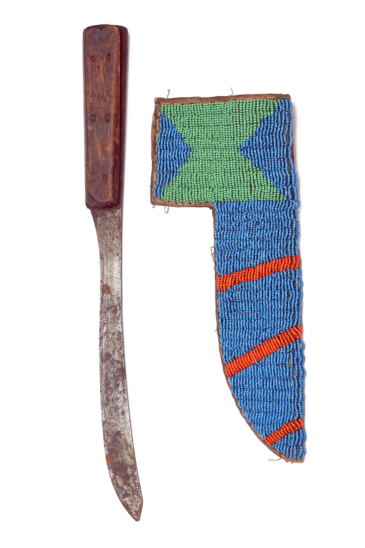 AN EARLIER AMERICAN PLAINS INDIAN GLASS BEADED LEATHER SCABBARD WITH KNIFE, circa late 19th-early 20th Century, canvas-lined scabbard with extended throat, decorated with blue, green and red glass bead-work to the front, together with an associated worn and crudely fashioned knife with 9 in. unmarked single-edged slightly curved steel blade with wooden grips secured with steel rivets, 14 1/4 in. overall length