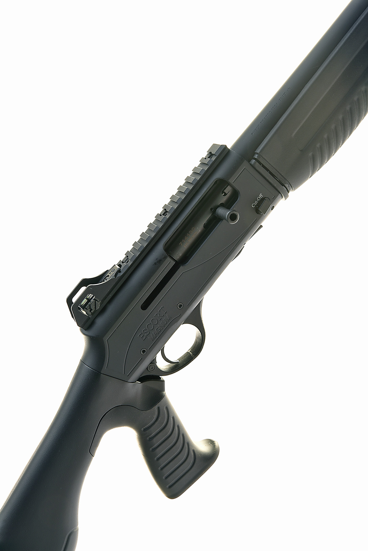 A LIGHTLY-USED F.A.C. HATSAN 12-BORE (3IN.) 'ESCORT MAGNUM' TACTICAL SEMI-AUTOMATIC SHOTGUN, serial no. 714130, for 2020, extended tubular magazine, 24in. high-performance steel-shot proved nitro barrel, raised high-visibility fore-sight, 3in. chamber, multichoke (with spares), receiver fitted with a picatinny rail with high-visibility battle rear sight, detachable carry handle, manual push-button safety, magazine cut-off switch, enlarged bolt charger handle, 14 1/4in. synthetic pistolgrip stock including rubber recoil pad, the butt with provision for two shotgun cartridges, the whole in matt black finish, weight 8lb. 2oz., in its maker cardboard carton