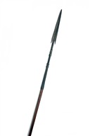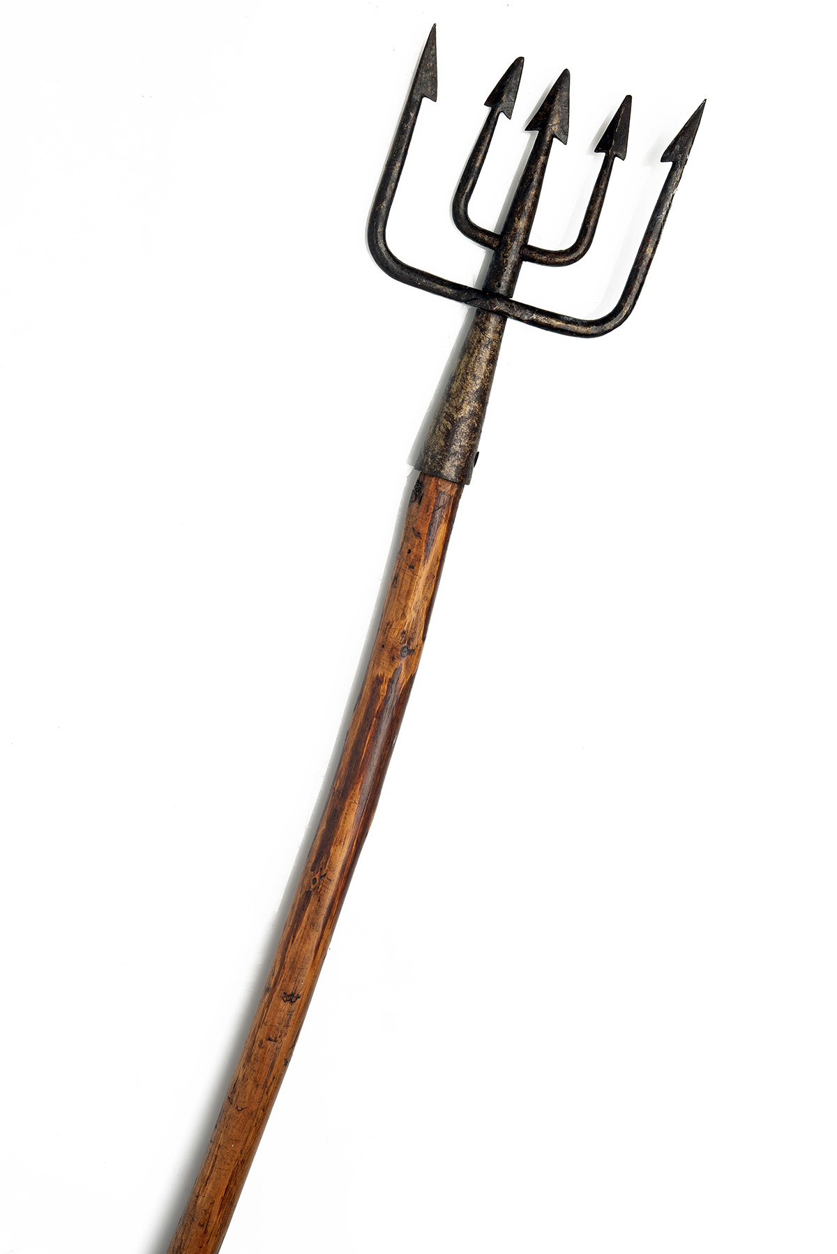 A SOUTH-CENTRAL AFRICAN FISHING SPEAR AND A FROG SPEAR, circa early 20th Century southern Sudan, Zande or Mangbetu tribe, socket-mounted, the fishing spear with decorated barbed shaft, haft terminal with wrapped iron counter-weights, 61 in.; the frog spear with five points, the iron being used being repurposed from British military material with some English script and a Broad Arrow remaining visible on the central spike between the head and lower cross-piece, haft replaced, 48 in.