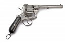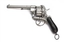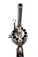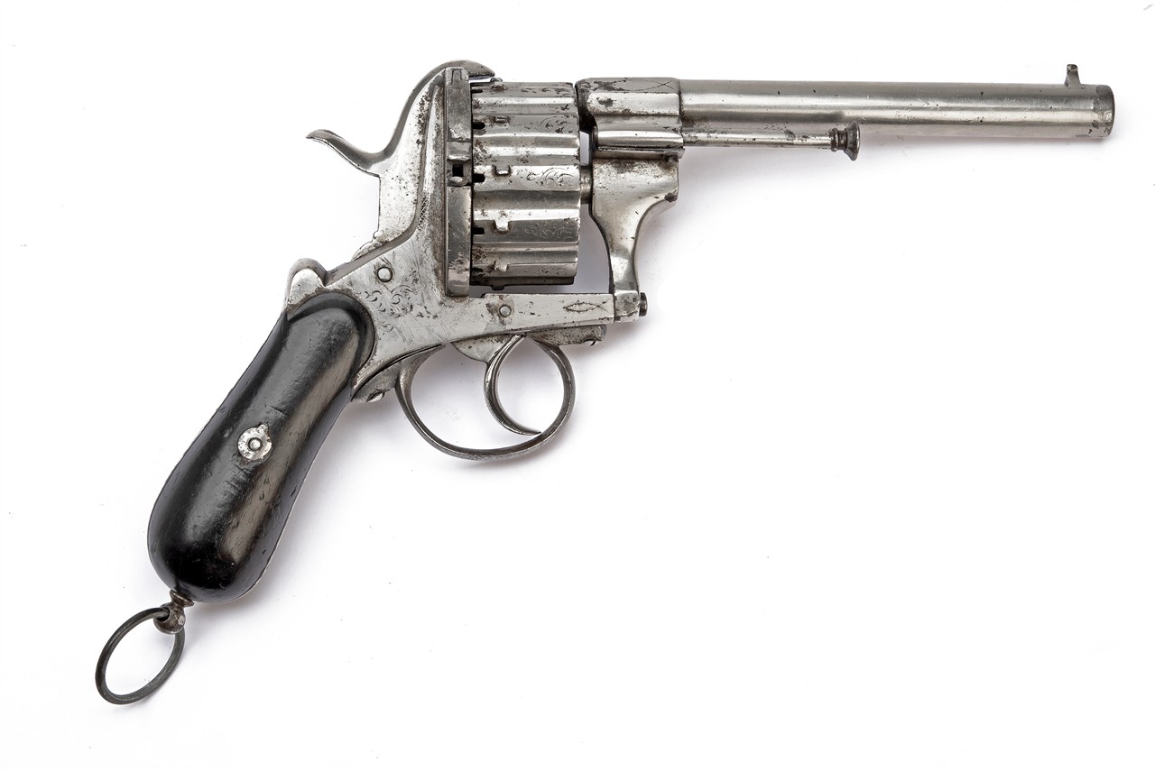 Belgian circa 1870 and possibly by Francotte, with round nickel-plated 6in. barrel, applied fore-sight, octagonal breech with borderline arabesque engraving, the front of barrel mount stamped with an 'F' below a crown, open iron frame engraved with further arabesques and scrolls, fully fluted twelve-shot cylinder, loading gate to recoil shield, double action mechanism with guarded trigger, smooth ebony bag-shaped grips with lanyard ring at heel and plunge ejector, retaining a fair amount of an older replating