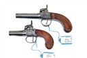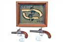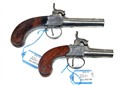 TWO PERCUSSION BOXLOCK POCKET-PISTOLS, ONE SIGNED SMITH, THE OTHER NOCK, no visible serial numbers, with a display case, both circa 1840, the first with round turn-off 1 3/4in. 40-bore barrel, engraved action signed 'SMITH, LONDON' with central hammer and guarded trigger, slab-sided walnut butt, the second similar but with 3in. 46-bore barrel, action signed 'NOCK, LONDON', both with Birmingham proofs, the latter not holding on cock, with a glazed display case suitable for wall mounting fitted for these pistols