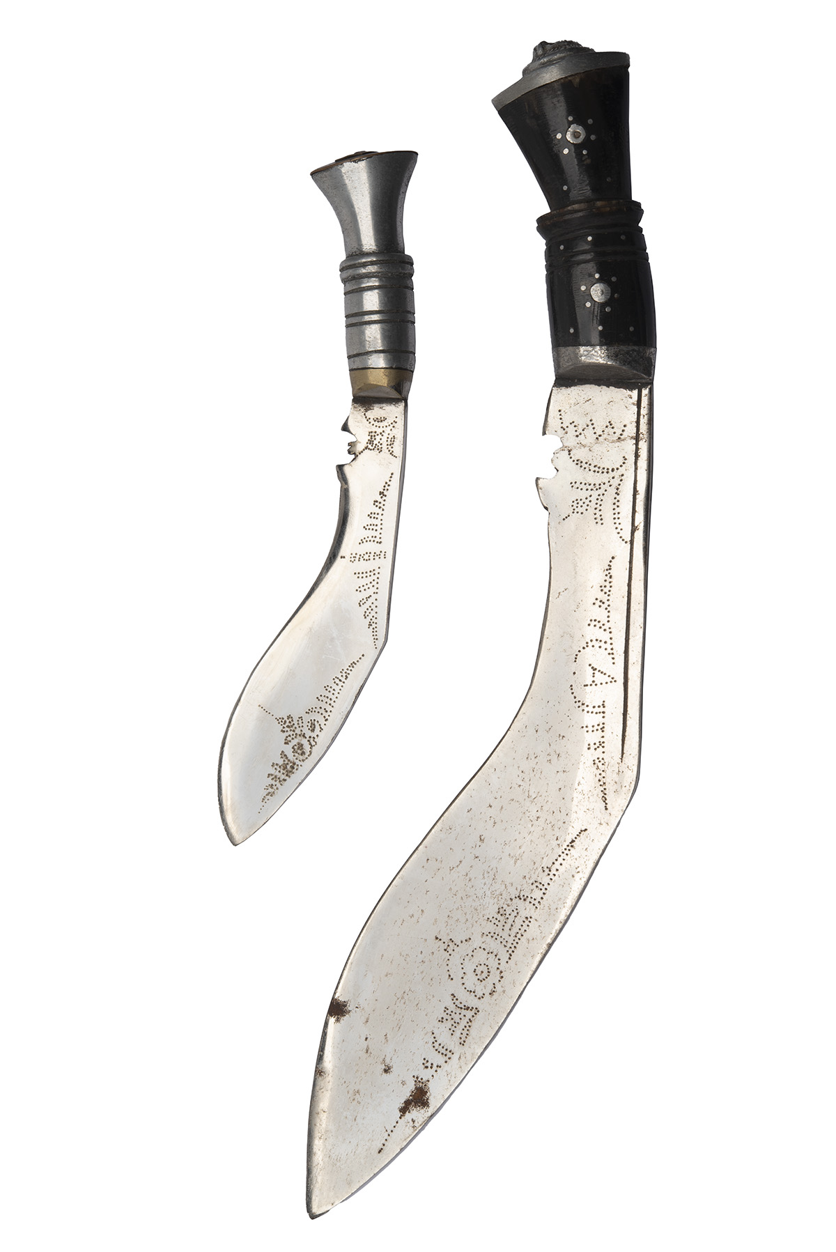 TWO INDIAN SUBCONTINENT TOURIST KUKRIS mid-late 20th Century with nickel-plated steel blades of typical form with punched decoration, being 1) 11 in. blade with wooden handle, 15 in. overall; 2) 6 in. blade with brass and alloy handle, 9 in. overall; both worn with rust patches (2)