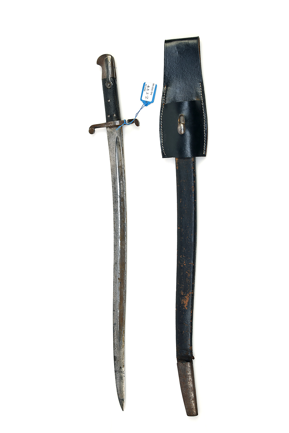 A PATTERN 1856/58 YATAGHAN SWORD BAYONET, circa 1860, with 23 in. single-edged blade fullered on each side, steel cross-guard, pressed leather grips, bird's-head pommel, together with its black leather scabbard with steel fittings and reproduction frog, worn, blade stained and pitted with all markings apparently rubbed out, cross-guard and pommel heavily cleaned and filed to remove deep pitting, grips shrunk, scabbard heavily worn with failed stitching, and torn above the chape, locket and chape rusted and pitted