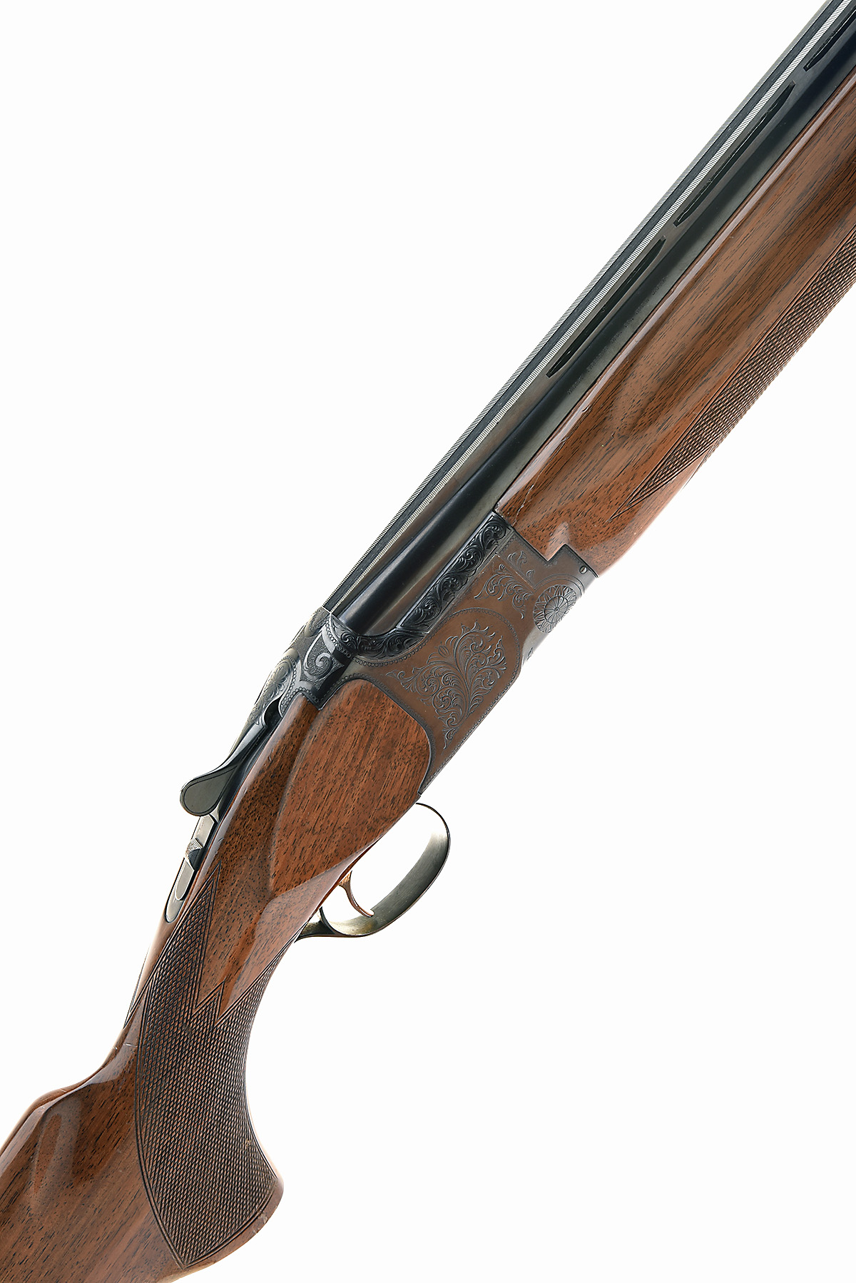 B.C. MIROKU 12-BORE SINGLE-TRIGGER OVER AND UNDER EJECTOR, serial no. 679612, circa 1979, 28in. nitro barrels with 15mm ventilated matt top-rib, 2 3/4in. chambers, bored approx. true cyl. in both, hold-open toplever, manual safety with integral barrel selector switch, gold-washed single trigger, beaded border and acanthus scroll engraving, 14 1/2in. pistolgrip stock including buttplate, weight 8lb.