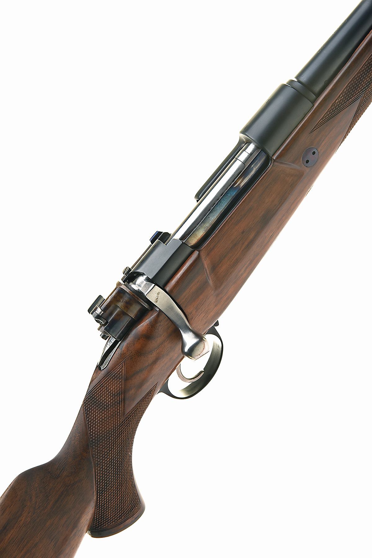 JOHN DICKSON & SON. .270 WIN. BOLT-MAGAZINE SPORTING RIFLE, serial no. 74173, circa 1975, 21 1/4in. nitro reproved barrel (in 2026), threaded muzzle with thread cap, open rear sight with two folding leaf sights, marked for 100, 200 and 300 yards, engraved 'JOHN DICKSON & SON. 21 FREDERICK STREET. EDINBURGH.' and 'CALIBRE .270', receiver with thumb cut-out, drilled on for scope mount bases, with screw blanks fitted, manual colour-hardened flag safety with gold-inlaid 'SAFE' detail, timney trigger, gold-washed magazine lifter, hinged floorplate, pistolgrip halfstock with horn pistolgrip cap and fore-end finial, cheekpiece, 15in. pull including rubber recoil pad, weight 8lb. 4oz.