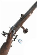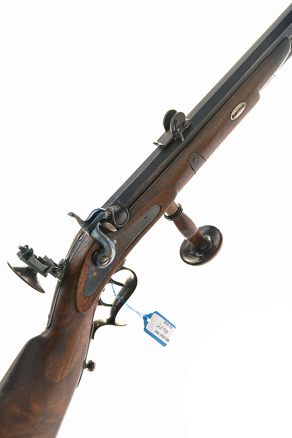 A 10mm PERCUSSION CONTINENTAL TARGET-RIFLE, SIGNATURE OBSCURED, no visible serial number, probably Swiss or German circa 1850, with heavy octagonal 32 1/4in. barrel, recessed muzzle, tunnel fore-sight, elevating tangent rear-sight, plain top-tang with adjustable peep-sight, hump-backed lock with traces of signature, walnut Swiss-style half-stock (expertly repaired at wrist), iron furniture, double set trigger and under-barrel ramrod and mushroom palm-rest, restored throughout
