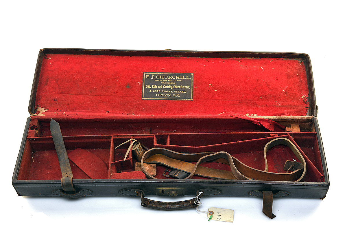 A LEATHER SINGLE GUNCASE, fitted for 30in. barrels, the interior lined with red baize (moth damage), an E.J. Churchill trade label, brass lock (key missing)
