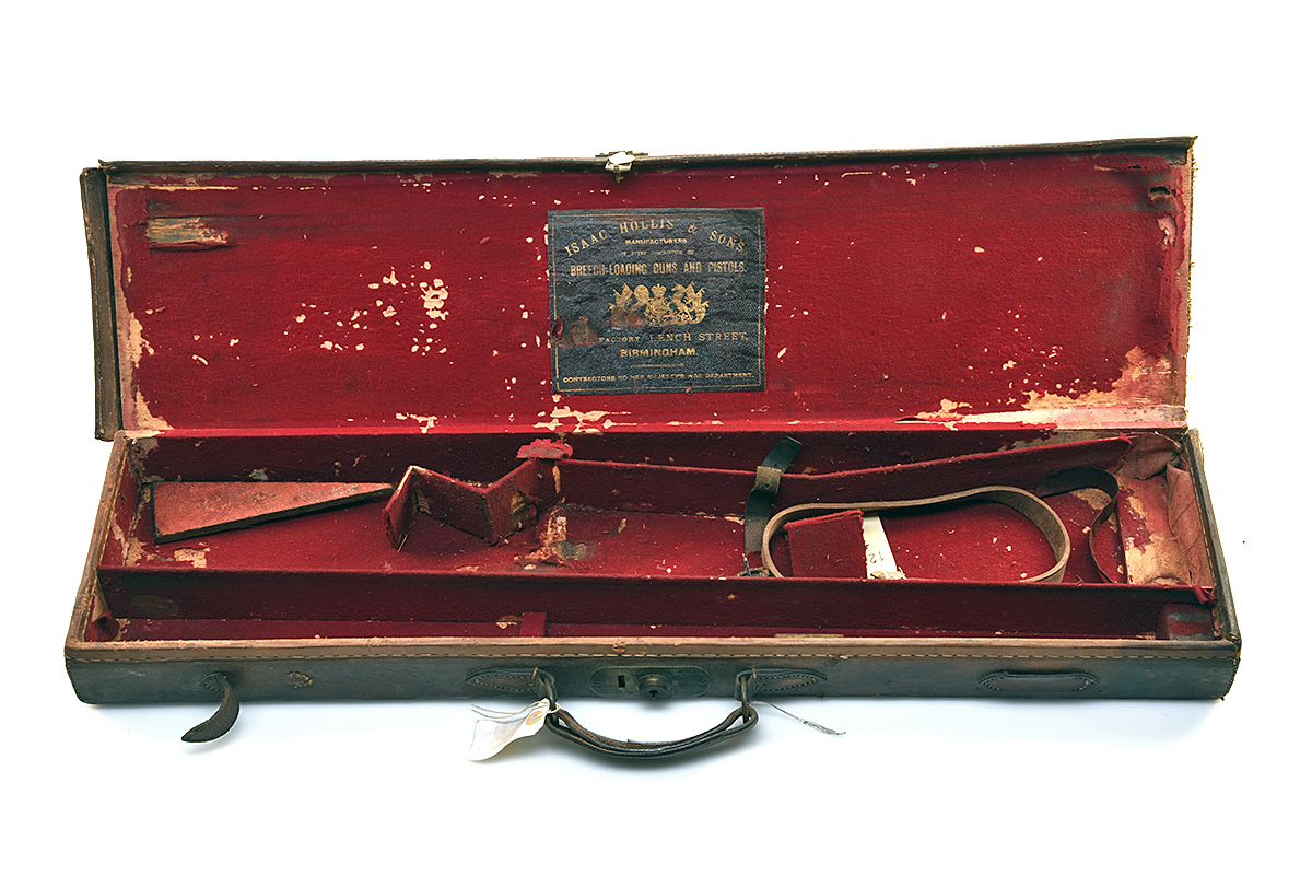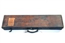 A LEATHER SINGLE GUNCASE, fitted for 30in. barrels, the interior lined with red baize (moth damage), an Isaac Hollis & Sons trade label, brass lock (key missing)
