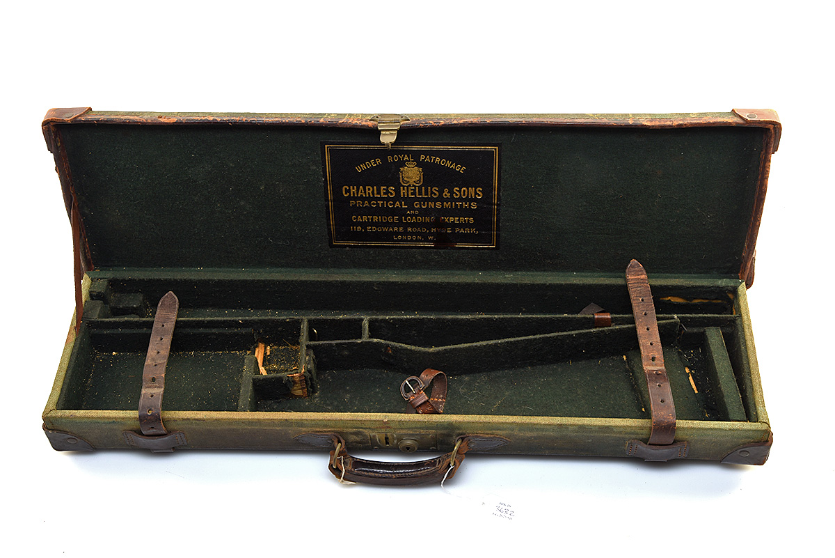 A CANVAS AND LEATHER SINGLE GUNCASE, fitted for 30in. barrels, the interior lined with green baize, a leather gold-tooled Charles Hellis & Sons trade label, brass lock (key missing)