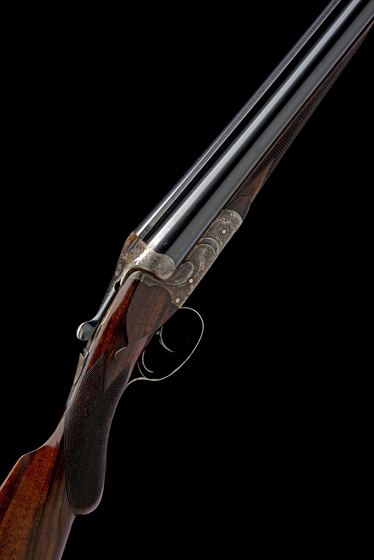 for 1905, 26in. nitro barrels with raised matt rib, tubes engraved 'W. & C. SCOTT & SON. "THE RELIANCE". 78. SHAFTESBURY AVENUE. LONDON.', 2 1/2in. chambers, bored approx. imp. cyl. and full choke, scoop-backed treble-grip action with side-clips and teardrop side-bolsters, manual safety, fine acanthus scroll engraving, retaining much original colour-hardening and finish, 14 1/2in. figured semi-pistolgrip stock including 1in. rubber recoil pad, bolstered fore-end wood, weight 6lb. 7oz.