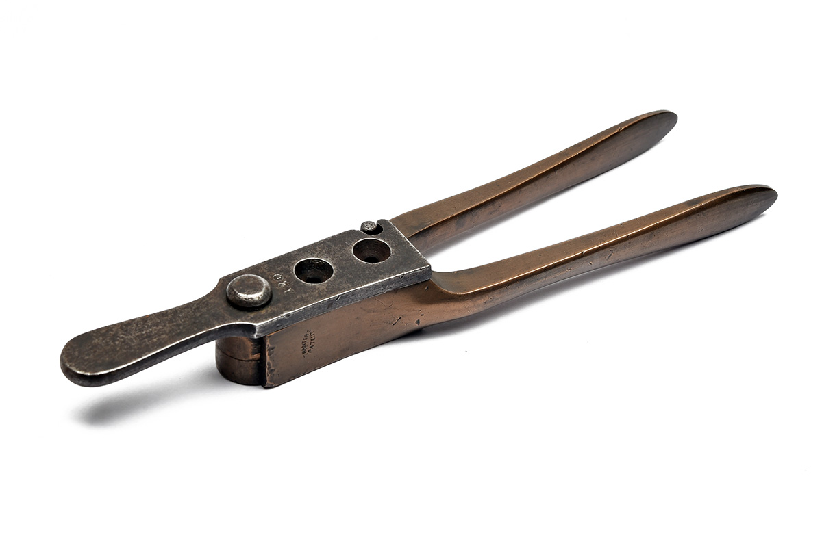 A GOOD AND RARE 120-BORE TRANTER DUEL CAVITY BULLET MOULD, circa 1870s, brass with steel sprue-cutter, stamped 'TRANTER'S / PATIENT' and '120', a few edge-chips to the brass only, 7 3/4 in. overall length