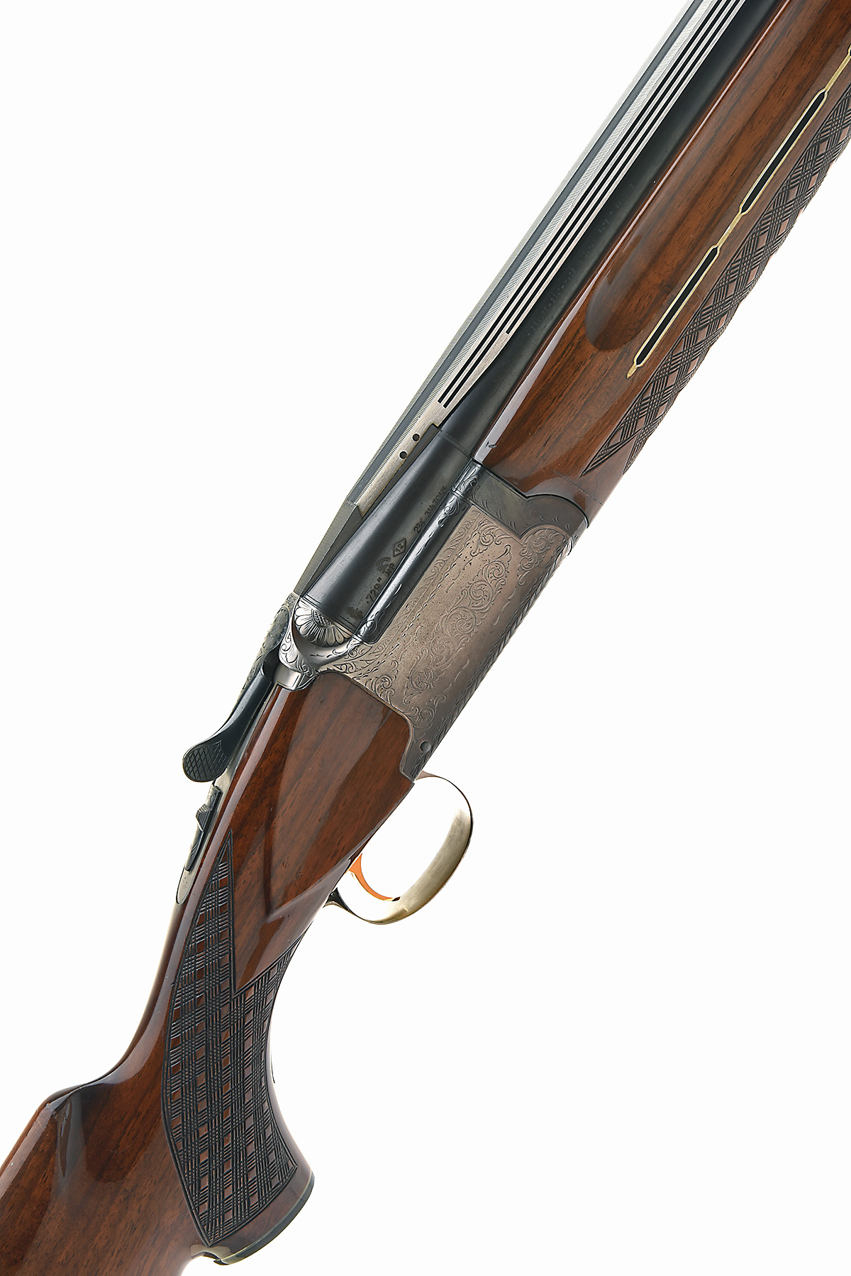 NIKKO ARMS CO. 12-BORE 'SHADOW' SINGLE-TRIGGER OVER AND UNDER EJECTOR, serial no. K705104, dated 1974, 29 3/4in. nitro barrels with iconic broad 20mm ventilated matt 'Airflow' top-rib, 2 3/4in. chambers, bored approx. 1/4 and 1/2 choke, hold-open toplever, manual safety with integral barrel selector switch, gold-washed single trigger, border and partial scroll engraving, silver finish, 14 1/4in. diamond chequered pistolgrip stock with pistolgrip cap, including 7/8in. rubber recoil pad, characteristic ventilated semi-beavertail fore-end with lined vents, weight 8lb. 3oz.