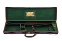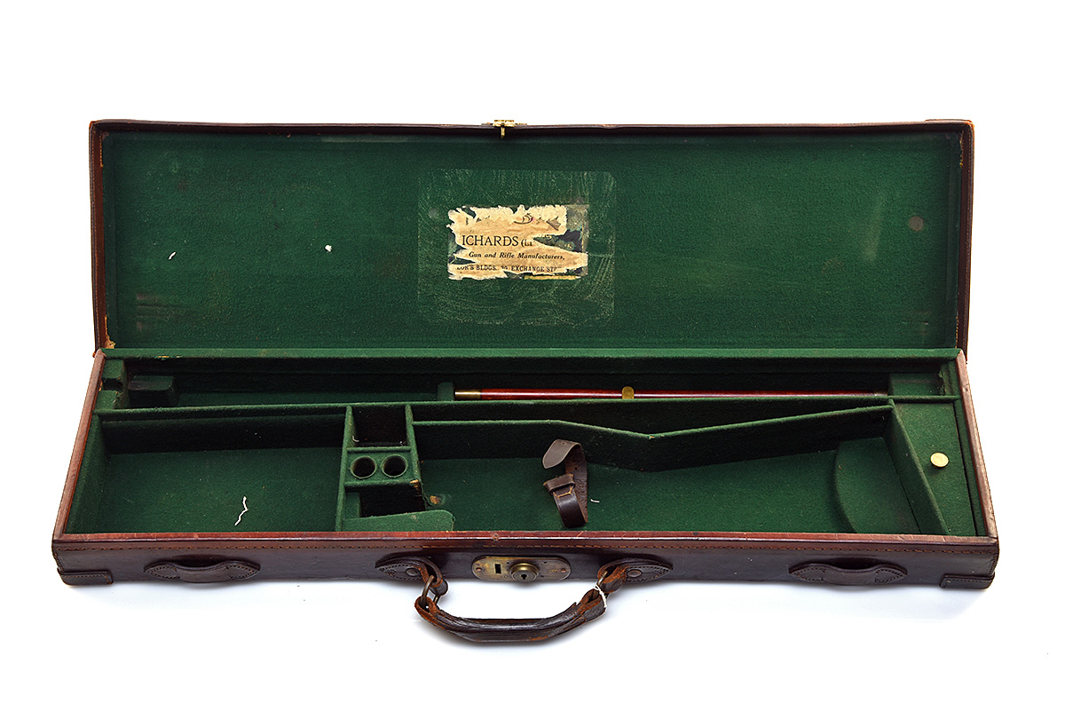 A LEATHER SINGLE GUNCASE, fitted for 30in. barrels, the interior lined with green baize, torn Richards trade label, brass lock (key missing), the lid exterior marked 'B.D.'