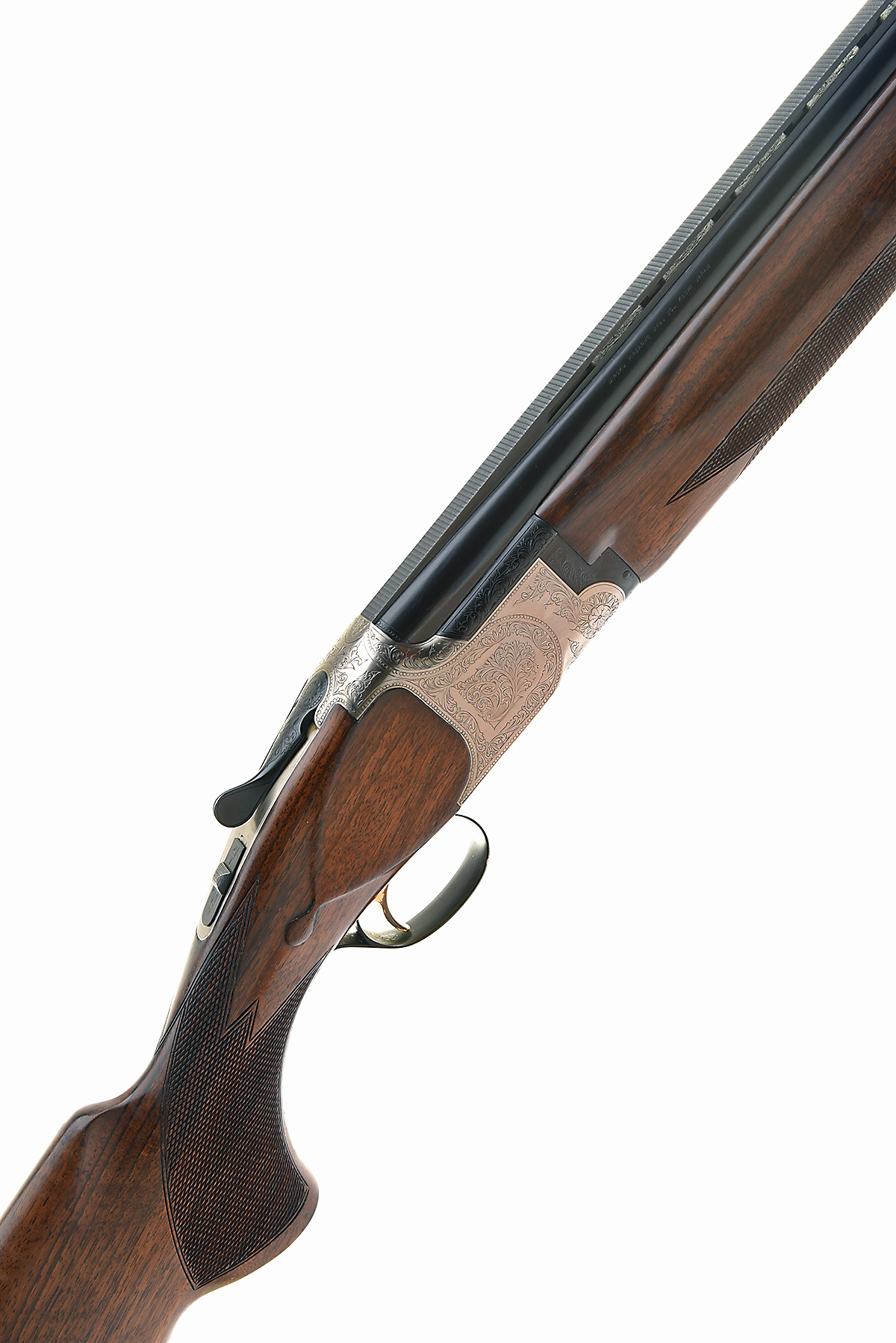 B.C. MIROKU 12-BORE SINGLE-TRIGGER OVER AND UNDER EJECTOR, serial no. 346170, circa 1976, 26in. nitro barrels with 10mm ventilated matt top-rib, 2 3/4in. chambers, bored approx. true cyl. in both, hold-open toplever, manual safety with integral barrel selector switch, gold-washed single trigger, beaded border and acanthus scroll engraving, 14 1/4in. pistolgrip stock including buttplate, weight 7lb. 8oz.