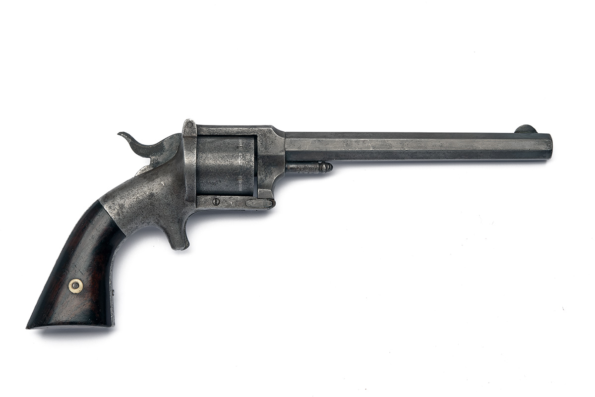 circa 1861, the octagonal 6in. barrel signed on the top-flat 'L.W. POND, WORCESTER MASS. PAT'D JULY 10 1860', tip-up two piece iron frame hinged at rear of top-strap, push button release to left hand lower frame (working replacement), plain cylinder, colour hardened hammer, spur trigger and smooth flared walnut grips, the heel with provision for ejector rod (absent)