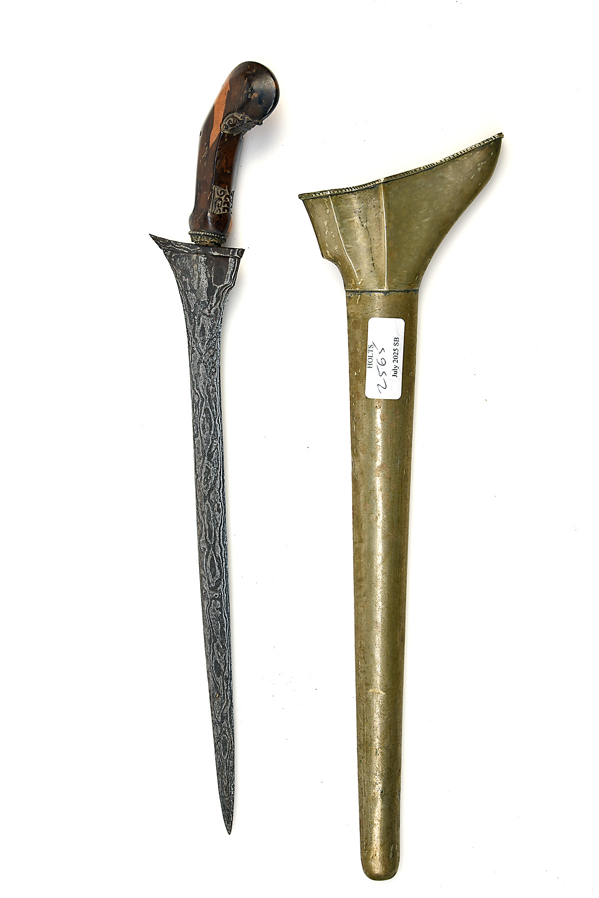 A BETTER JAVANESE KRIS WITH WHITE METAL SCABBARD, circa early 20th Century, 14 in. double-edged straight blade of patterned steel, carved wooden handle, wooden scabbard covered with white metal plate, some light knocks to the scabbard metal, 20 in. overall