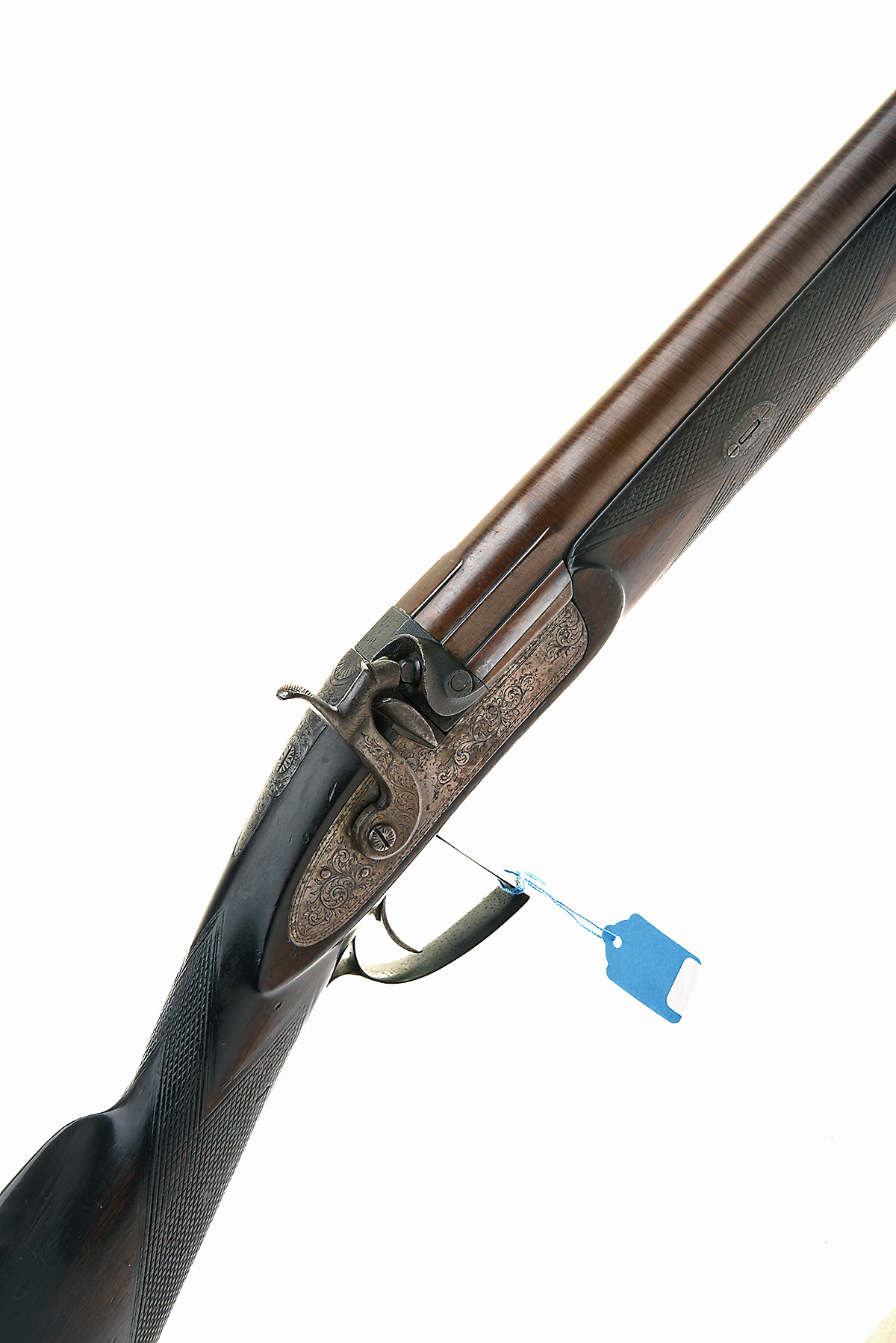 AN 8-BORE PERCUSSION SINGLE-BARRELLED FOWLING-PIECE CONVERTED FOR LIVE PIGEON, UNSIGNED, no visible serial number, circa 1845 with conversion circa 1865, with rebrowned tapering round 34 1/2in. barrel, re-engraved bar-action lock, chequered walnut half-stock, the fore-end tip rounded off and filled over a pre-existing ramrod aperture, square-fronted trigger guard bow