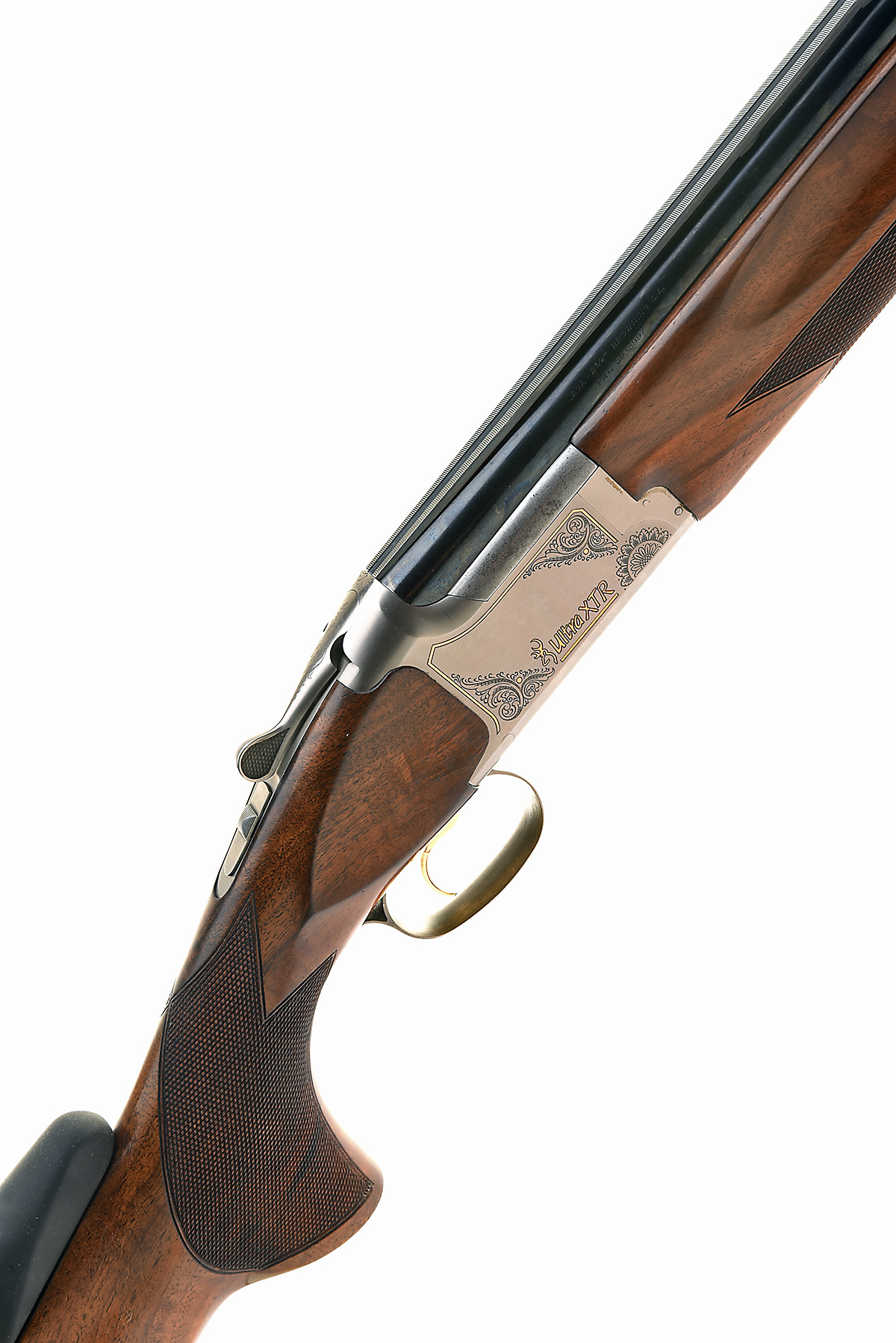 BROWNING 12-BORE 'ULTRA XTR' SINGLE-TRIGGER OVER AND UNDER EJECTOR, serial no. 57386MP, dated 2008, 32in. high performance steel proof nitro barrels with ventilated mid-rib and 12mm ventilated matt top-rib, 2 3/4in. chambers, multichokes (with spares), hold-open toplever, manual safety with integral barrel selector switch, gold-washed adjustable single trigger, partial acanthus scroll with gold border, 14 1/4in. pistolgrip stock with rubber comb, including 1in. ventilated rubber recoil pad, weight 9lb. 7oz., in its makers universal case