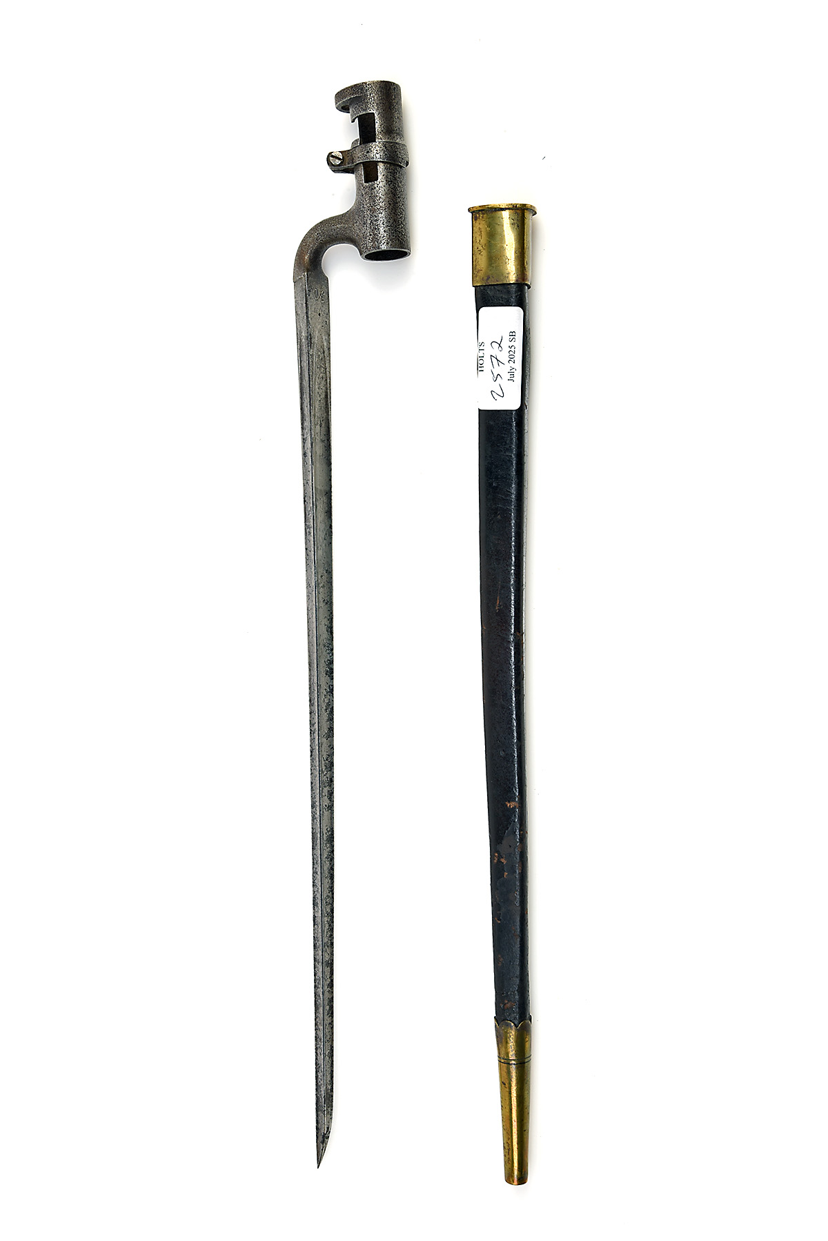 A PATTERN 1853 SOCKET BAYONET BY DEAKIN FOR THE ENFIELD RIFLED MUSKET, circa 1860s, with 17 in. triangular blade fullered on three sides, ricasso stamped 'DEAKIN' and '30', together with its black leather scabbard with brass fittings, blade stained, socket pitted, chape loose