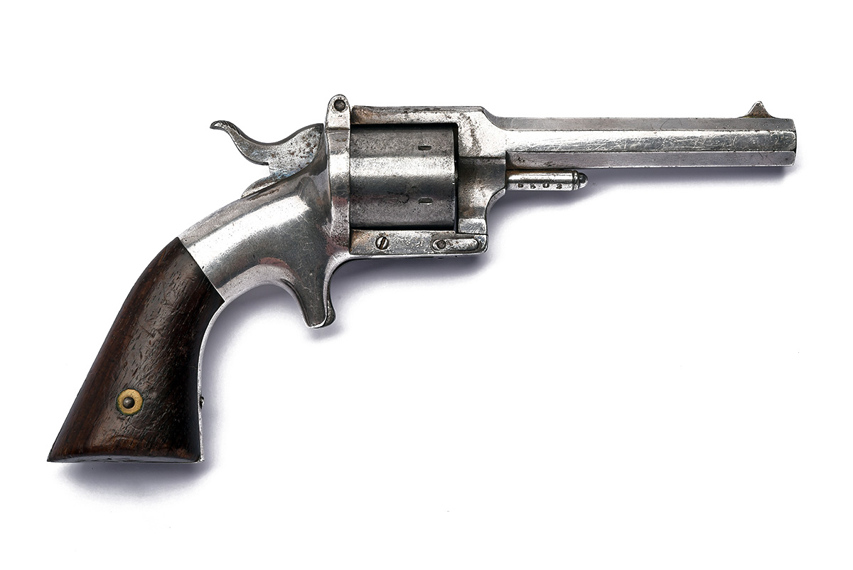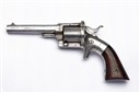 A .32 RIMFIRE L.W POND TIP-UP REVOLVER, UNSIGNED, serial no. 6503, circa 1861, the octagonal 4in. barrel with later silver-plating, tip-up two piece plated iron frame hinged at rear of top-strap, push button release to left hand lower frame, plain cylinder, colour hardened hammer, spur trigger and smooth flared walnut grips, the heel with the provision for ejector rod blanked off and plated over