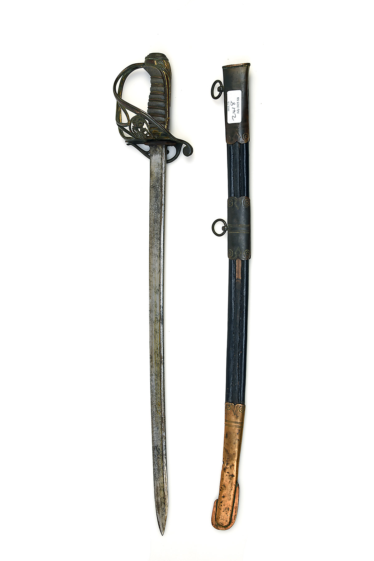 A PATTERN 1822 GEORGE IV INFANTRY OFFICER'S SWORD, circa 1830s, with 24 in. pipe-backed blade etched both sides with royal cypher, folding Gothic hilt with George IV cypher, brass hilt with wire-bound fish-skin grip with its black leather scabbard with grass fittings, worn, blade with pitting towards the point, etching weak, guard bent, scabbard fittings dented, stud replaced, chape split, central suspension ring band loose