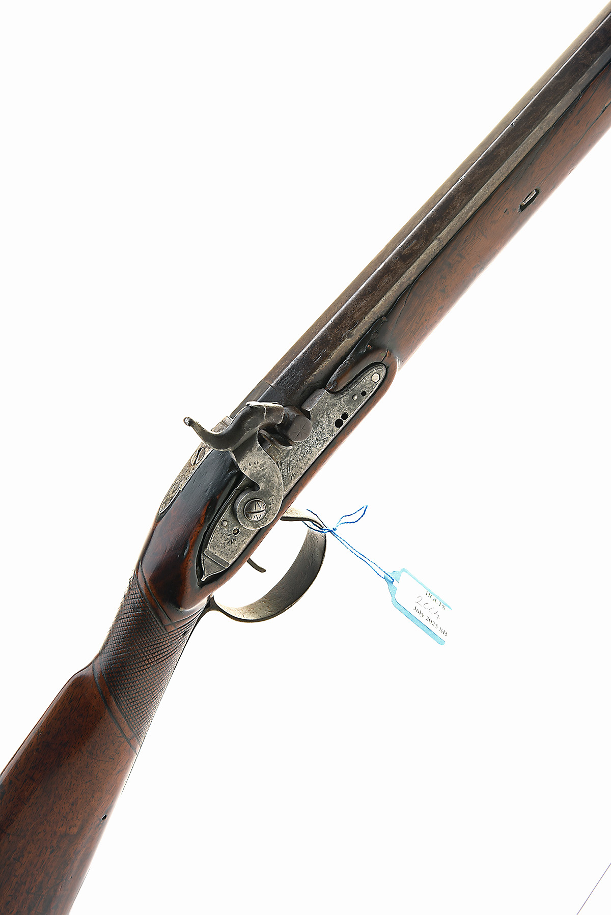 A 16-BORE PERCUSSION SINGLE-BARRELLED SPORTING-GUN POSSIBLY SIGNED HARCOURT, no visible serial number, circa 1780 with later conversion from flint, with 38 1/4in. octagonal to round barrel (rubbed externally), bevel-edged lock with drum and nipple breech, walnut half-stock chequered at the wrist (repairs) brass furniture and replacement trigger guard and lower tang, worn