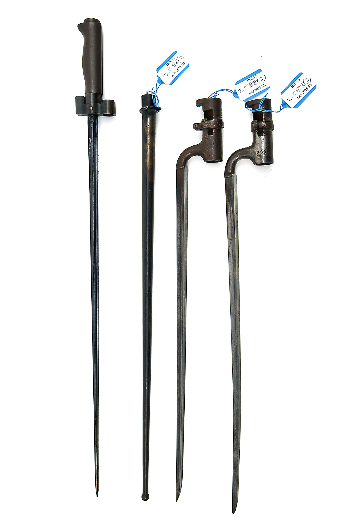 TWO PATTERN 1853 BAYONETS AND A FRENCH MODEL 1886/15 BAYONET, the two P1853 socket bayonets with one stamped 'WB' plus Birmingham inspection mark, the socket stamped '7 / B / 130', the other with indistinct maker's details and Birmingham inspection mark, plus '7 / 689' on the socket, both with stained blades and rusted sockets, no scabbards; the M1886/15 in good condition with matching numbers of F4640 (3)