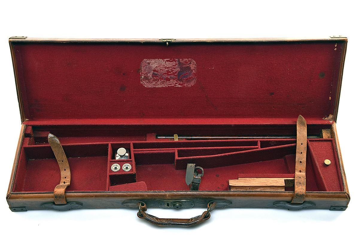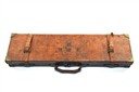 A BRASS-CORNERED LEATHER SINGLE GUNCASE, fitted for 30in. barrels, the interior lined with red baize, two-piece cleaning rod, oil bottle, pair 12-bore snap-caps, brass lock (key missing), the lid exterior marked 'J.F.L.L.H.H.'