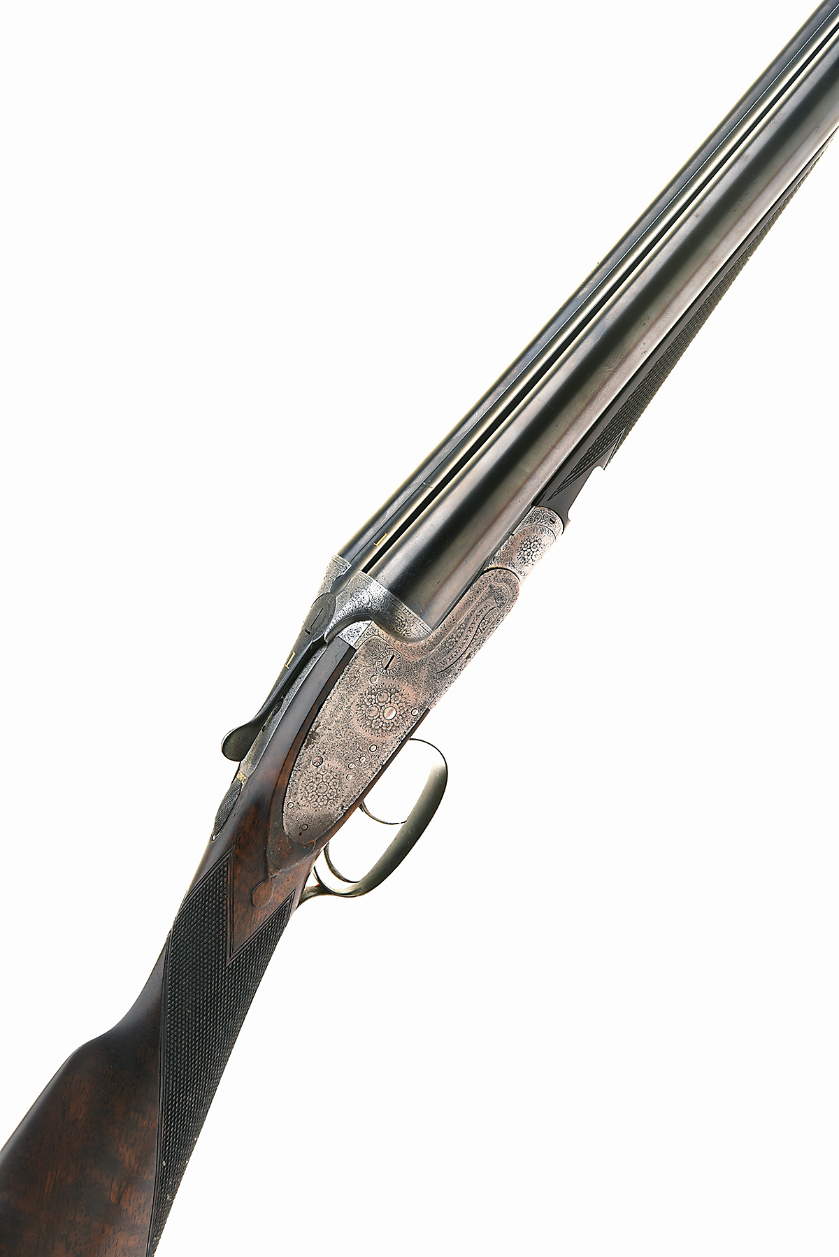 WILLIAM EVANS 12-BORE SIDELOCK EJECTOR, serial no. 4665, circa 1900, 28in. sleeved nitro barrels, 2 1/2in. chambers, bored approx. 1/4 and 3/4 choke, treble-grip action, removable striker discs, toplever gold-inlaid '1', automatic safety, border and acanthus scroll engraving with floral bouquets, 14 3/8in. replacement stock, weight 6lb. 8oz.
