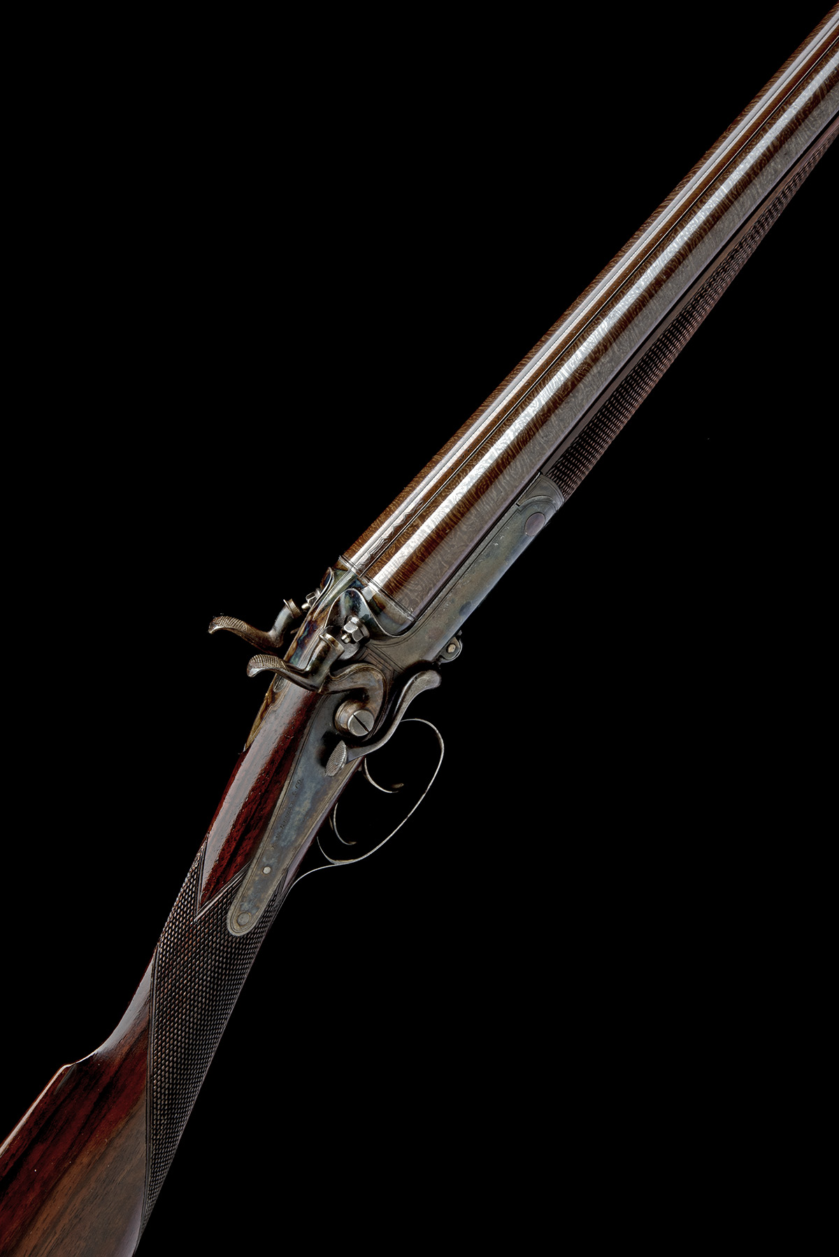 circa 1875, 28in. black powder only reproved damascus barrels (in 2025), the rib engraved 'E.M. REILLY & CO. 16. NEW OXFORD STREET. LONDON & PARIS.', the breech end with Celtic latticework, 2in. chambers, bored approx. true cyl. in both, carved fences, sidelever opening, rebounding back-action locks, border engraving, retaining much apparently original colour-hardening and finish, 14 1/4in. stock including steel buttplate, Hackett-type snap-on splinter fore-end with horn finial, weight 4lb. 10oz., together with its period burgundy slip