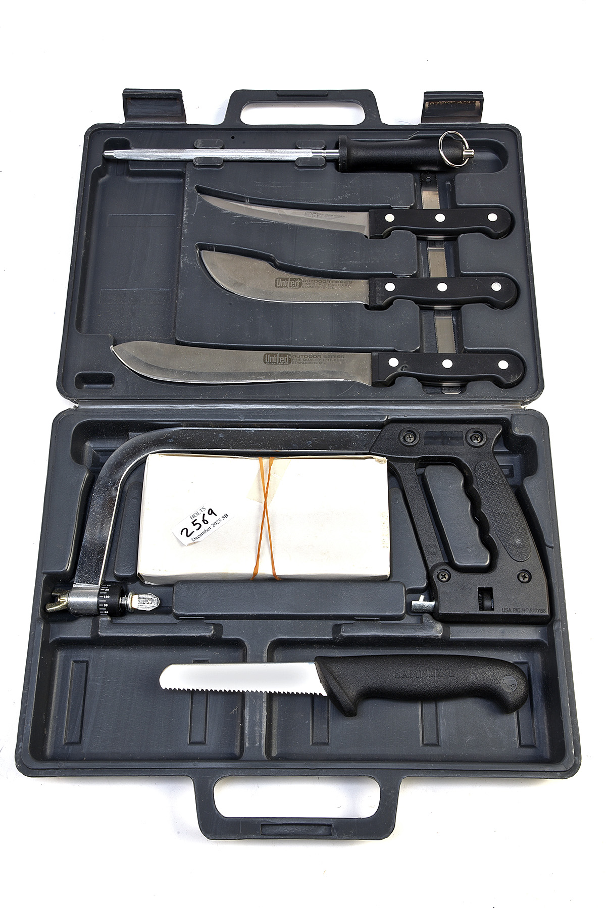 A CASED 'UNITED OUTDOORS' DEER STALKERS PROCESSING KIT, comprising of approx. 6in. skinning blade, full tang, plastic scale handle, approx. 5 1/2in. trail point skinning blade, full tang, plastic scale handle, approx. 8in. drop point blade, full tang, plastic scale handle, 'SAMPRENE approx. 4 1/2in. serrated blade, plastic handle, hacksaw with blade, blade sharpener in makers plastic carry case