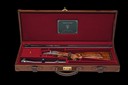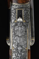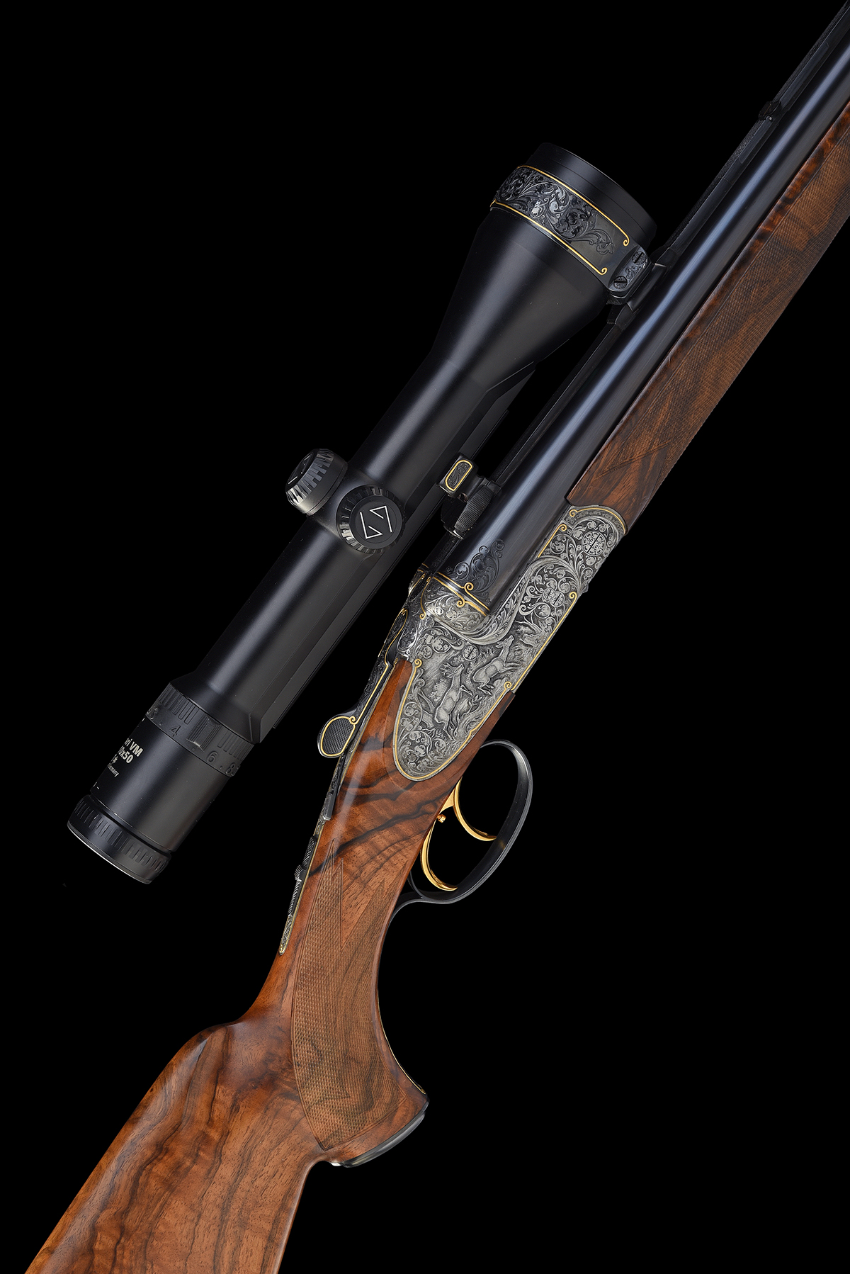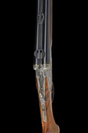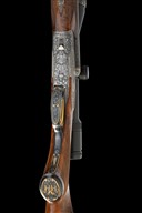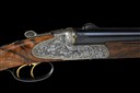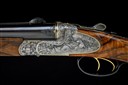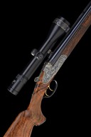 for 2001, 26in. nitro reproved barrels (in 2026), wave-cut matt rib gold-inlaid 'J. FANZOJ - FERLACH.', flip-up open rear sight, ramped bead fore-sight, the breech end fitted with a Zeiss Diavari VM 2,5-10x50 T* telescopic sight, serial no. 2422410, in quickly-detachable mounts, the scope ring and mount engraved with acanthus scrollwork and with gold-inlaid bordering, the tubes engraved at the breech ends with acanthus scroll detailing and gold-inlaid bands, 3in. shot chambers, bored approx. 1/4 and 3/4 choke, treble-grip action with short side bolsters, removable striker discs, manual safety with gold-inlaid 'S' detail, manual shot / ball selector switch with gold-inlaid 'SCH' and 'K' details, and actuating the flip-up rear sight, gold-washed triggers with set front trigger, double rolled-edge triggerguard, bold acanthus scroll engraving surrounding scenes of hound flushing pheasant on the left side and roe deer in a woodland setting on the right against matted backgrounds, the underside with a coat of arms, gold-inlaid bordering, 15in. well-figured pistolgrip stock with right hand palm-swell, engraved and gold-inlaid steel pistolgrip cap, carved cheekpiece, sling swivels hinged trapdoor for five cartridges, including 3/4in. leather covered rubber recoil pad, weight 8lb. (unscoped), 9lb. 5oz. (scoped), in its leather case with provision for scope