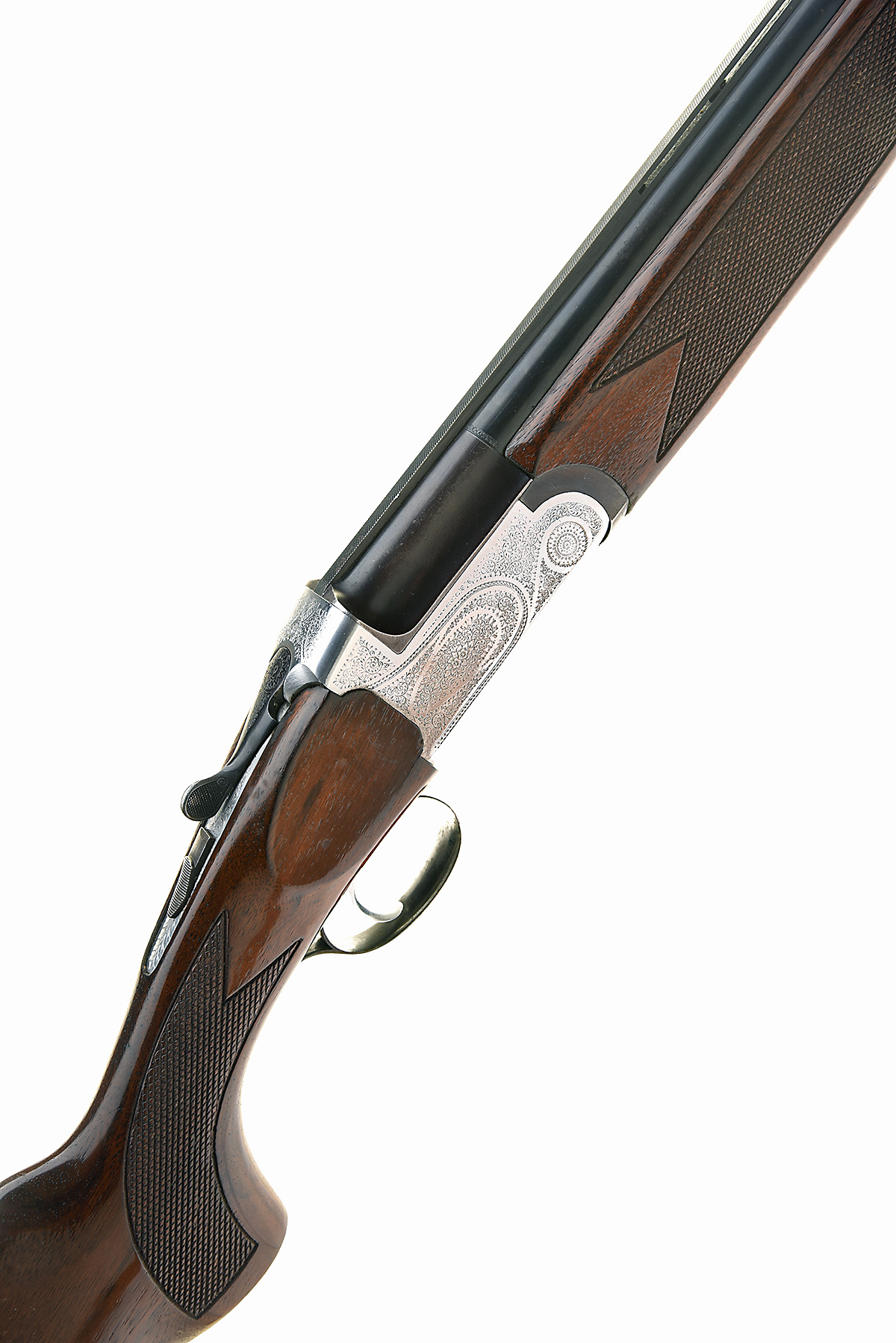 MIDLAND GUN CO. 12-BORE SINGLE-TRIGGER OVER AND UNDER EJECTOR, serial no. 72705, dated 1984, 27 3/4in. nitro barrels with ventilated mid-rib and 6mm ventilated matt top-rib, 2 3/4in. chambers, bored approx. imp. cyl. and 1/2 choke, hold-open toplever, manual safety, acanthus scroll engraving, 15in. pistolgrip stock including 1in. rubber recoil pad