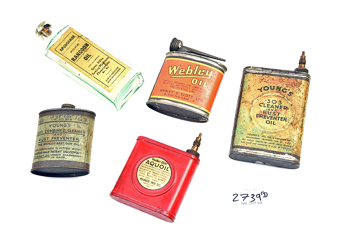 FIVE VINTAGE OIL CANS, 1 'WEBLEY' 1 'YOUNGS' .303 no. 193E, 1 'YOUNGS' .303 no. 193D, 1 'SPENGARDE' RANGOON OIL, 1 'PARKER HALE' aquoil (5)