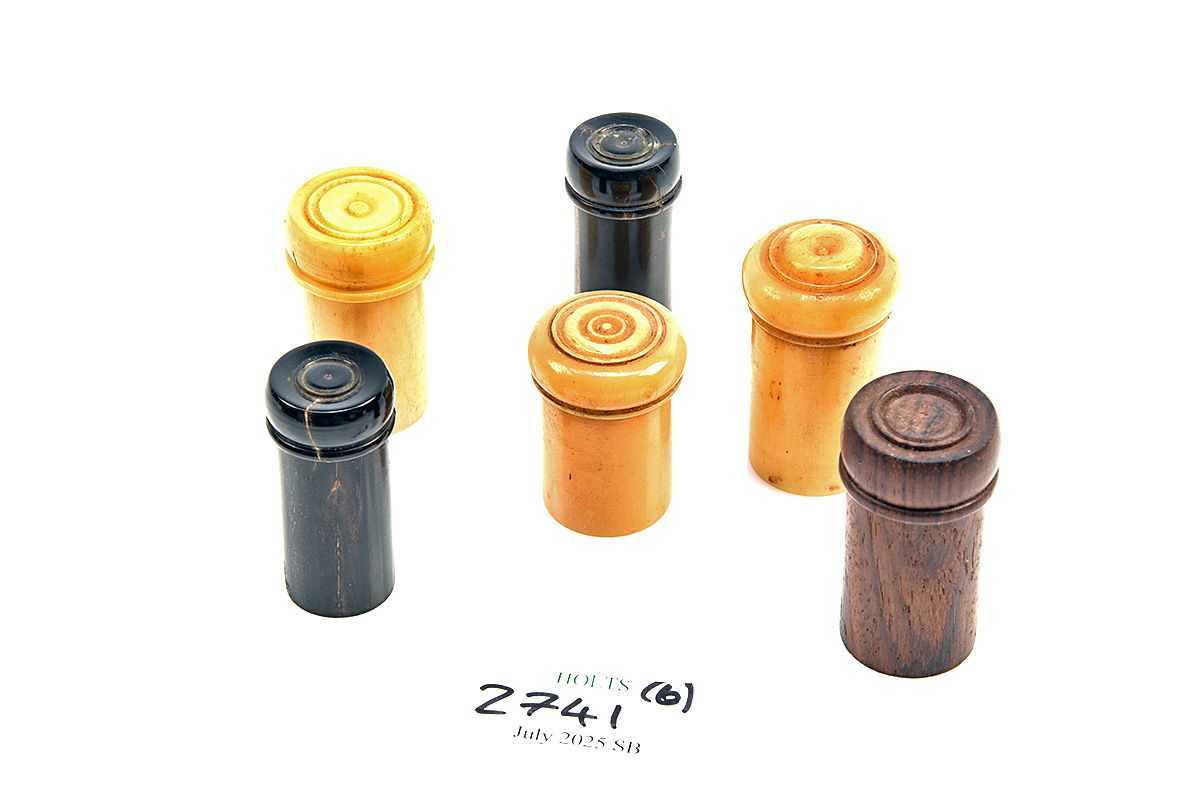 SIX VINTAGE VARIOUS BONE, HORN AND WOOD STRIKER POTS, (6)